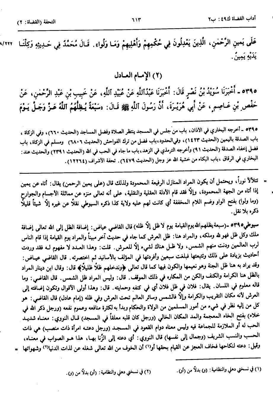 الْإِمَامُ الْعَادِلُ 5395 - أَخْبَرَنَا سُوَيْدُ بْنُ نَصْرٍ قَالَ أَنْبَأَنَا عَبْدُ اللَّهِ عَنْ عُبَيْدِ اللَّهِ عَنْ خَبِيبِ بْنِ عَبْدِ الرَّحْمَنِ عَنْ حَفْصِ بْنِ عَاصِمٍ عَنْ أَبِي هُرَيْرَةَ أَنَّ رَسُولَ اللَّهِ صَلَّى اللَّهُ عَلَيْهِ وَسَلَّمَ قَالَ سَبْعَةٌ يُظِلُّهُمْ اللَّهُ عَزَّ وَجَلَّ يَوْمَ الْقِيَامَةِ يَوْمَ لَا ظِلَّ إِلَّا ظِلُّهُ إِمَامٌ عَادِلٌ وَشَابٌّ نَشَأَ فِي عِبَادَةِ اللَّهِ عَزَّ وَجَلَّ وَرَجُلٌ ذَكَرَ اللَّهَ فِي خَلَاءٍ فَفَاضَتْ عَيْنَاهُ وَرَجُلٌ كَانَ قَلْبُهُ مُعَلَّقًا فِي الْمَسْجِدِ وَرَجُلَانِ تَحَابَّا فِي اللَّهِ عَزَّ وَجَلَّ وَرَجُلٌ دَعَتْهُ امْرَأَةٌ ذَاتُ مَنْصِبٍ وَجَمَالٍ إِلَى نَفْسِهَا فَقَالَ إِنِّي أَخَافُ اللَّهَ عَزَّ وَجَلَّ وَرَجُلٌ تَصَدَّقَ بِصَدَقَةٍ فَأَخْفَاهَا حَتَّى لَا تَعْلَمَ شِمَالُهُ مَا صَنَعَتْ يَمِينُهُ
