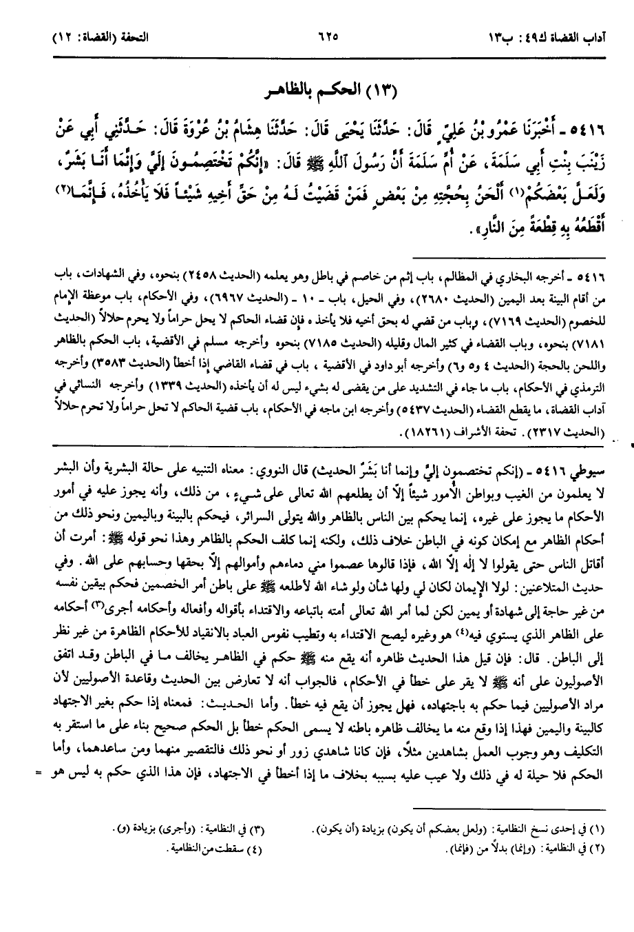 الْحُكْمُ بِالظَّاهِرِ 5416 - أَخْبَرَنَا عَمْرُو بْنُ عَلِيٍّ قَالَ حَدَّثَنَا يَحْيَى قَالَ حَدَّثَنَا هِشَامُ بْنُ عُرْوَةَ قَالَ حَدَّثَنِي أَبِي عَنْ زَيْنَبَ بِنْتِ أَبِي سَلَمَةَ عَنْ أُمِّ سَلَمَةَ أَنَّ رَسُولَ اللَّهِ صَلَّى اللَّهُ عَلَيْهِ وَسَلَّمَ قَالَ إِنَّكُمْ تَخْتَصِمُونَ إِلَيَّ وَإِنَّمَا أَنَا بَشَرٌ وَلَعَلَّ بَعْضَكُمْ أَلْحَنُ بِحُجَّتِهِ مِنْ بَعْضٍ فَمَنْ قَضَيْتُ لَهُ مِنْ حَقِّ أَخِيهِ شَيْئًا فَلَا يَأْخُذْهُ فَإِنَّمَا أَقْطَعُهُ بِهِ قِطْعَةً مِنْ النَّارِ