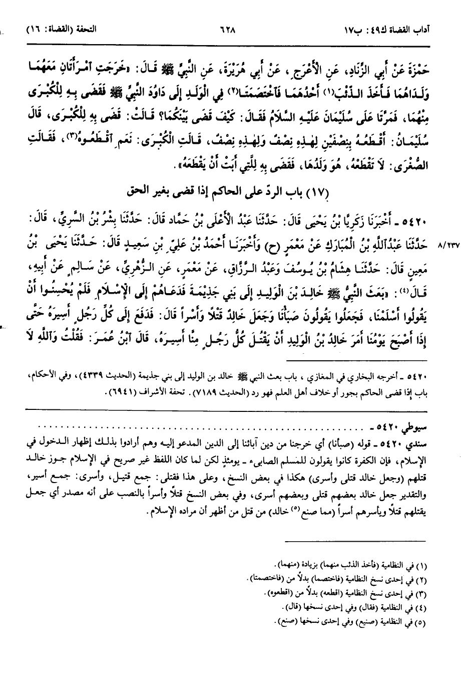 بَاب الرَّدِّ عَلَى الْحَاكِمِ إِذَا قَضَى بِغَيْرِ الْحَقِّ 5420 - أَخْبَرَنَا زَكَرِيَّا بْنُ يَحْيَى قَالَ حَدَّثَنَا عَبْدُ الْأَعْلَى بْنُ حَمَّادٍ قَالَ حَدَّثَنَا بِشْرُ بْنُ السَّرِيِّ قَالَ حَدَّثَنَا عَبْدُ اللَّهِ بْنُ الْمُبَارَكِ عَنْ مَعْمَرٍ ح وَأَنْبَأَنَا أَحْمَدُ بْنُ عَلِيِّ بْنِ سَعِيدٍ قَالَ حَدَّثَنَا يَحْيَى بْنُ مَعِينٍ قَالَ حَدَّثَنَا هِشَامُ بْنُ يُوسُفَ وَعَبْدُ الرَّزَّاقِ عَنْ مَعْمَرٍ عَنْ الزُّهْرِيِّ عَنْ سَالِمٍ عَنْ أَبِيهِ قَالَ بَعَثَ النَّبِيُّ صَلَّى اللَّهُ عَلَيْهِ وَسَلَّمَ خَالِدَ بْنَ الْوَلِيدِ إِلَى بَنِي جَذِيمَةَ فَدَعَاهُمْ إِلَى الْإِسْلَامِ فَلَمْ يُحْسِنُوا أَنْ يَقُولُوا أَسْلَمْنَا فَجَعَلُوا يَقُولُونَ صَبَأْنَا وَجَعَلَ خَالِدٌ قَتْلًا وَأَسْرًا قَالَ فَدَفَعَ إِلَى كُلِّ رَجُلٍ أَسِيرَهُ حَتَّى إِذَا أَصْبَحَ يَوْمُنَا أَمَرَ خَالِدُ بْنُ الْوَلِيدِ أَنْ يَقْتُلَ كُلُّ رَجُلٍ مِنَّا أَسِيرَهُ قَالَ ابْنُ عُمَرَ فَقُلْتُ وَاللَّهِ لَا أَقْتُلُ أَسِيرِي وَلَا يَقْتُلُ أَحَدٌ وَقَالَ بِشْرٌ مِنْ أَصْحَابِي أَسِيرَهُ قَالَ فَقَدِمْنَا عَلَى النَّبِيِّ صَلَّى اللَّهُ عَلَيْهِ وَسَلَّمَ فَذُكِرَ لَهُ صُنْعُ خَالِدٍ فَقَالَ النَّبِيُّ صَلَّى اللَّهُ عَلَيْهِ وَسَلَّمَ وَرَفَعَ يَدَيْهِ اللَّهُمَّ إِنِّي أَبْرَأُ إِلَيْكَ مِمَّا صَنَعَ خَالِدٌ قَالَ زَكَرِيَّا فِي حَدِيثِهِ فَذُكِرَ وَفِي حَدِيثِ بِشْرٍ فَقَالَ اللَّهُمَّ إِنِّي أَبْرَأُ إِلَيْكَ مِمَّا صَنَعَ خَالِدٌ مَرَّتَيْنِ