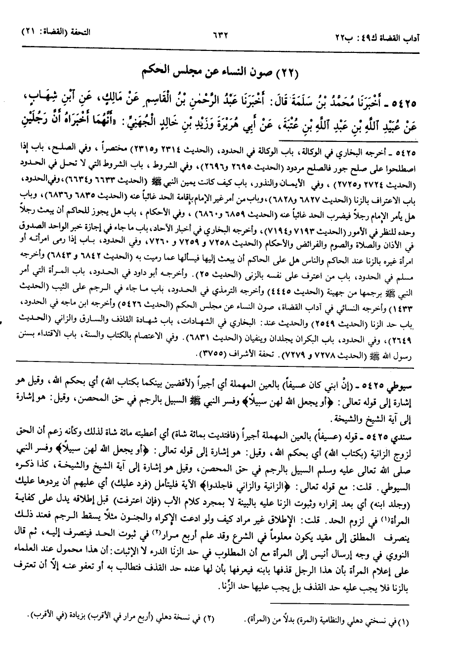5425 - أَخْبَرَنَا مُحَمَّدُ بْنُ سَلَمَةَ قَالَ أَنْبَأَنَا عَبْدُ الرَّحْمَنِ بْنُ الْقَاسِمِ عَنْ مَالِكٍ عَنْ ابْنِ شِهَابٍ عَنْ عُبَيْدِ اللَّهِ بْنِ عَبْدِ اللَّهِ بْنِ عُتْبَةَ عَنْ أَبِي هُرَيْرَةَ وَزَيْدِ بْنِ خَالِدٍ الْجُهَنِيِّ أَنَّهُمَا أَخْبَرَاهُ أَنَّ رَجُلَيْنِ اخْتَصَمَا إِلَى رَسُولِ اللَّهِ صَلَّى اللَّهُ عَلَيْهِ وَسَلَّمَ فَقَالَ أَحَدُهُمَا اقْضِ بَيْنَنَا بِكِتَابِ اللَّهِ وَقَالَ الْآخَرُ وَهُوَ أَفْقَهُهُمَا أَجَلْ يَا رَسُولَ اللَّهِ وَأْذَنْ لِي فِي أَنْ أَتَكَلَّمَ قَالَ إِنَّ ابْنِي كَانَ عَسِيفًا عَلَى هَذَا فَزَنَى بِامْرَأَتِهِ فَأَخْبَرُونِي أَنَّ عَلَى ابْنِي الرَّجْمَ فَافْتَدَيْتُ بِمِائَةِ شَاةٍ وَبِجَارِيَةٍ لِي ثُمَّ إِنِّي سَأَلْتُ أَهْلَ الْعِلْمِ فَأَخْبَرُونِي أَنَّمَا عَلَى ابْنِي جَلْدُ مِائَةٍ وَتَغْرِيبُ عَامٍ وَإِنَّمَا الرَّجْمُ عَلَى امْرَأَتِهِ فَقَالَ رَسُولُ اللَّهِ صَلَّى اللَّهُ عَلَيْهِ وَسَلَّمَ وَالَّذِي نَفْسِي بِيَدِهِ لَأَقْضِيَنَّ بَيْنَكُمَا بِكِتَابِ اللَّهِ أَمَّا غَنَمُكَ وَجَارِيَتُكَ فَرَدٌّ إِلَيْكَ وَجَلَدَ ابْنَهُ مِائَةً وَغَرَّبَهُ عَامًا وَأَمَرَ أُنَيْسًا أَنْ يَأْتِيَ امْرَأَةَ الْآخَرِ فَإِنْ اعْتَرَفَتْ فَارْجُمْهَا فَاعْتَرَفَتْ فَرَجَمَهَا
