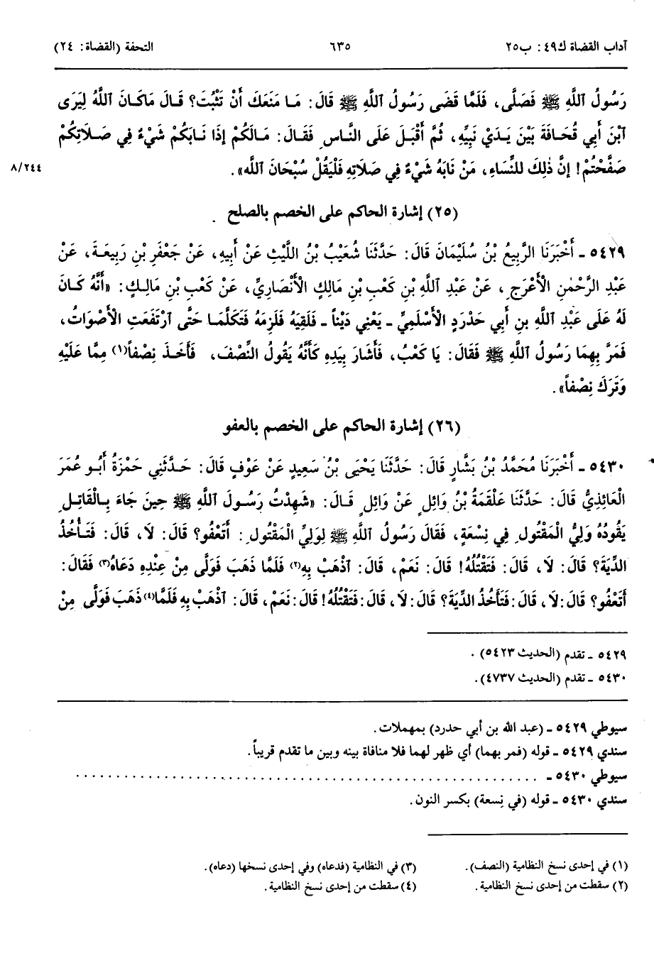 إِشَارَةُ الْحَاكِمِ عَلَى الْخَصْمِ بِالصُّلْحِ 5429 - أَخْبَرَنَا الرَّبِيعُ بْنُ سُلَيْمَانَ قَالَ حَدَّثَنَا شُعَيْبُ بْنُ اللَّيْثِ عَنْ أَبِيهِ عَنْ جَعْفَرِ بْنِ رَبِيعَةَ عَنْ عَبْدِ الرَّحْمَنِ الْأَعْرَجِ عَنْ عَبْدِ اللَّهِ بْنِ كَعْبِ بْنِ مَالِكٍ الْأَنْصَارِيِّ عَنْ كَعْبِ بْنِ مَالِكٍ أَنَّهُ كَانَ لَهُ عَلَى عَبْدِ اللَّهِ بْنِ أَبِي حَدْرَدٍ الْأَسْلَمِيِّ يَعْنِي دَيْنًا فَلَقِيَهُ فَلَزِمَهُ فَتَكَلَّمَا حَتَّى ارْتَفَعَتْ الْأَصْوَاتُ فَمَرَّ بِهِمَا رَسُولُ اللَّهِ صَلَّى اللَّهُ عَلَيْهِ وَسَلَّمَ فَقَالَ يَا كَعْبُ فَأَشَارَ بِيَدِهِ كَأَنَّهُ يَقُولُ النِّصْفَ فَأَخَذَ نِصْفًا مِمَّا عَلَيْهِ وَتَرَكَ نِصْفًا