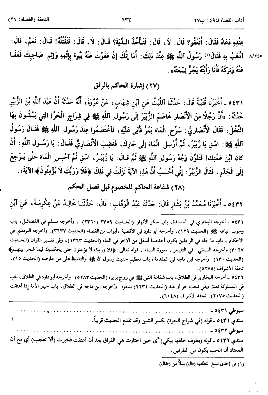 إِشَارَةُ الْحَاكِمِ بِالرِّفْقِ 5431 - أَخْبَرَنَا قُتَيْبَةُ قَالَ حَدَّثَنَا اللَّيْثُ عَنْ ابْنِ شِهَابٍ عَنْ عُرْوَةَ أَنَّهُ حَدَّثَهُ أَنَّ عَبْدَ اللَّهِ بْنَ الزُّبَيْرِ حَدَّثَهُ أَنَّ رَجُلَا مِنْ الْأَنْصَارِ خَاصَمَ الزُّبَيْرَ إِلَى رَسُولِ اللَّهِ صَلَّى اللَّهُ عَلَيْهِ وَسَلَّمَ فِي شِرَاجِ الْحَرَّةِ الَّتِي يَسْقُونَ بِهَا النَّخْلَ فَقَالَ الْأَنْصَارِيُّ سَرِّحْ الْمَاءَ يَمُرُّ فَأَبَى عَلَيْهِ فَاخْتَصَمُوا عِنْدَ رَسُولِ اللَّهِ صَلَّى اللَّهُ عَلَيْهِ وَسَلَّمَ فَقَالَ رَسُولُ اللَّهِ صَلَّى اللَّهُ عَلَيْهِ وَسَلَّمَ اسْقِ يَا زُبَيْرُ ثُمَّ أَرْسِلْ الْمَاءَ إِلَى جَارِكَ فَغَضِبَ الْأَنْصَارِيُّ فَقَالَ يَا رَسُولَ اللَّهِ أَنْ كَانَ ابْنَ عَمَّتِكَ فَتَلَوَّنَ وَجْهُ رَسُولِ اللَّهِ صَلَّى اللَّهُ عَلَيْهِ وَسَلَّمَ ثُمَّ قَالَ يَا زُبَيْرُ اسْقِ ثُمَّ احْبِسْ الْمَاءَ حَتَّى يَرْجِعَ إِلَى الْجَدْرِ قَالَ الزُّبَيْرُ إِنِّي أَحْسَبُ أَنَّ هَذِهِ الْآيَةَ نَزَلَتْ فِي ذَلِكَ { فَلَا وَرَبِّكَ لَا يُؤْمِنُونَ } الْآيَةَ