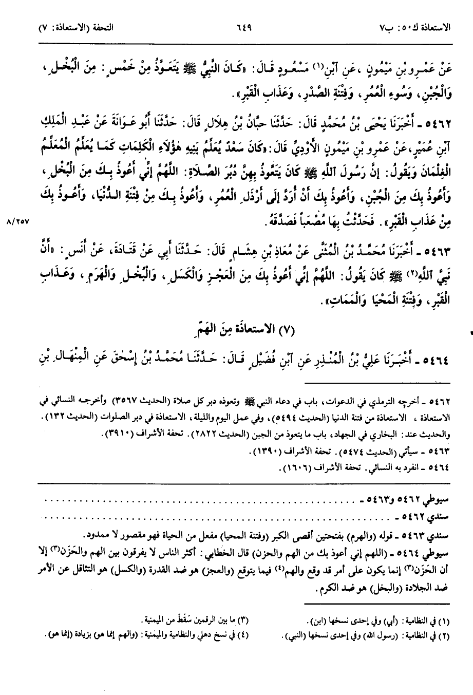 الِاسْتِعَاذَةُ مِنْ الْهَمِّ 5464 - أَخْبَرَنَا عَلِيُّ بْنُ الْمُنْذِرِ عَنْ ابْنِ فُضَيْلٍ قَالَ حَدَّثَنَا مُحَمَّدُ بْنُ إِسْحَقَ عَنْ الْمِنْهَالِ بْنِ عَمْرٍو عَنْ أَنَسِ بْنِ مَالِكٍ قَالَ كَانَ لِرَسُولِ اللَّهِ صَلَّى اللَّهُ عَلَيْهِ وَسَلَّمَ دَعَوَاتٌ لَا يَدَعُهُنَّ كَانَ يَقُولُ اللَّهُمَّ إِنِّي أَعُوذُ بِكَ مِنْ الْهَمِّ وَالْحَزَنِ وَالْعَجْزِ وَالْكَسَلِ وَالْبُخْلِ وَالْجُبْنِ وَغَلَبَةِ الرِّجَالِ