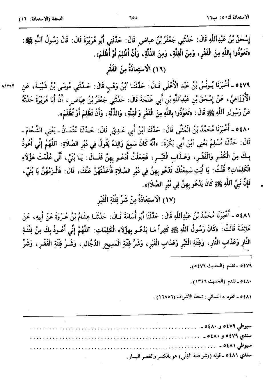 5480 - أَخْبَرَنَا مُحَمَّدُ بْنُ الْمُثَنَّى قَالَ حَدَّثَنَا ابْنُ أَبِي عَدِيٍّ قَالَ حَدَّثَنَا عُثْمَانُ يَعْنِي الشَّحَّامَ قَالَ حَدَّثَنَا مُسْلِمٌ يَعْنِي ابْنَ أَبِي بَكْرَةَ أَنَّهُ كَانَ سَمِعَ وَالِدَهُ يَقُولُ فِي دُبُرِ الصَّلَاةِ اللَّهُمَّ إِنِّي أَعُوذُ بِكَ مِنْ الْكُفْرِ وَالْفَقْرِ وَعَذَابِ الْقَبْرِ فَجَعَلْتُ أَدْعُو بِهِنَّ فَقَالَ يَا بُنَيَّ أَنَّى عُلِّمْتَ هَؤُلَاءِ الْكَلِمَاتِ قُلْتُ يَا أَبَتِ سَمِعْتُكَ تَدْعُو بِهِنَّ فِي دُبُرِ الصَّلَاةِ فَأَخَذْتُهُنَّ عَنْكَ قَالَ فَالْزَمْهُنَّ يَا بُنَيَّ فَإِنَّ نَبِيَّ اللَّهِ صَلَّى اللَّهُ عَلَيْهِ وَسَلَّمَ كَانَ يَدْعُو بِهِنَّ فِي دُبُرِ الصَّلَاةِ