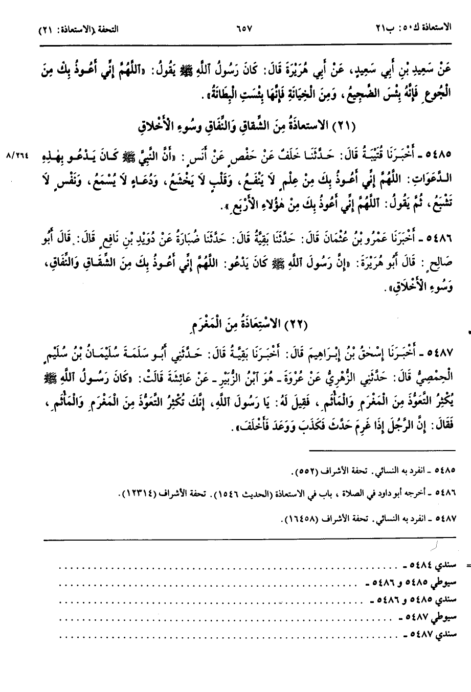 5486 - أَخْبَرَنَا عَمْرُو بْنُ عُثْمَانَ قَالَ حَدَّثَنَا بَقِيَّةُ قَالَ حَدَّثَنَا ضُبَارَةُ عَنْ دُوَيْدِ بْنِ نَافِعٍ قَالَ قَالَ أَبُو صَالِحٍ قَالَ أَبُو هُرَيْرَةَ أَنَّ رَسُولَ اللَّهِ صَلَّى اللَّهُ عَلَيْهِ وَسَلَّمَ كَانَ يَدْعُو اللَّهُمَّ إِنِّي أَعُوذُ بِكَ مِنْ الشِّقَاقِ وَالنِّفَاقِ وَسُوءِ الْأَخْلَاقِ