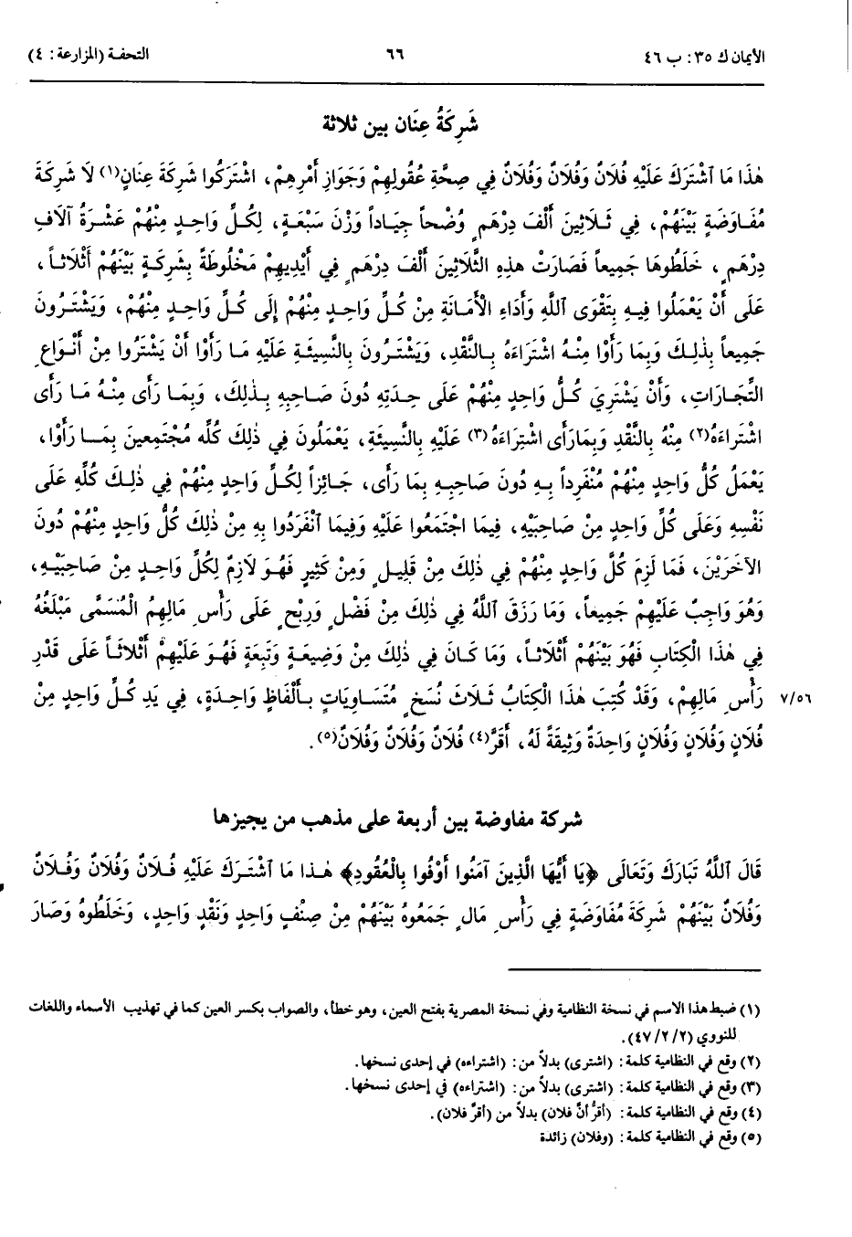 شَرِكَةُ عَنَانٍ بَيْنَ ثَلَاثَةٍ هَذَا مَا اشْتَرَكَ عَلَيْهِ فُلَانٌ وَفُلَانٌ وَفُلَانٌ فِي صِحَّةِ عُقُولِهِمْ وَجَوَازِ أَمْرِهِمْ اشْتَرَكُوا شَرِكَةَ عَنَانٍ لَا شَرِكَةَ مُفَاوَضَةٍ بَيْنَهُمْ فِي ثَلَاثِينَ أَلْفَ دِرْهَمٍ وُضْحًا جِيَادًا وَزْنَ سَبْعَةٍ لِكُلِّ وَاحِدٍ مِنْهُمْ عَشَرَةَ آلَافِ دِرْهَمٍ خَلَطُوهَا جَمِيعًا فَصَارَتْ هَذِهِ الثَّلَاثِينَ أَلْفَ دِرْهَمٍ فِي أَيْدِيهِمْ مَخْلُوطَةً بِشَرِكَةٍ بَيْنَهُمْ أَثْلَاثًا عَلَى أَنْ يَعْمَلُوا فِيهِ بِتَقْوَى اللَّهِ وَأَدَاءِ الْأَمَانَةِ مِنْ كُلِّ وَاحِدٍ مِنْهُمْ إِلَى كُلِّ وَاحِدٍ مِنْهُمْ وَيَشْتَرُونَ جَمِيعًا بِذَلِكَ وَبِمَا رَأَوْا مِنْهُ اشْتِرَاءَهُ بِالنَّقْدِ وَيَشْتَرُونَ بِالنَّسِيئَةِ عَلَيْهِ مَا رَأَوْا أَنْ يَشْتَرُوا مِنْ أَنْوَاعِ التِّجَارَاتِ وَأَنْ يَشْتَرِيَ كُلُّ وَاحِدٍ مِنْهُمْ عَلَى حِدَتِهِ دُونَ صَاحِبِهِ بِذَلِكَ وَبِمَا رَأَى مِنْهُ مَا رَأَى اشْتِرَاءَهُ مِنْهُ بِالنَّقْدِ وَبِمَا رَأَى اشْتِرَاءَهُ عَلَيْهِ بِالنَّسِيئَةِ يَعْمَلُونَ فِي ذَلِكَ كُلِّهِ مُجْتَمِعِينَ بِمَا رَأَوْا وَيَعْمَلُ كُلُّ وَاحِدٍ مِنْهُمْ مُنْفَرِدًا بِهِ دُونَ صَاحِبِهِ بِمَا رَأَى جَائِزًا لِكُلِّ وَاحِدٍ مِنْهُمْ فِي ذَلِكَ كُلِّهِ عَلَى نَفْسِهِ وَعَلَى كُلِّ وَاحِدٍ مِنْ صَاحِبَيْهِ فِيمَا اجْتَمَعُوا عَلَيْهِ وَفِيمَا انْفَرَدُوا بِهِ مِنْ ذَلِكَ كُلُّ وَاحِدٍ مِنْهُمْ دُونَ الْآخَرَيْنِ فَمَا لَزِمَ كُلَّ وَاحِدٍ مِنْهُمْ فِي ذَلِكَ مِنْ قَلِيلٍ وَمِنْ كَثِيرٍ فَهُوَ لَازِمٌ لِكُلِّ وَاحِدٍ مِنْ صَاحِبَيْهِ وَهُوَ وَاجِبٌ عَلَيْهِمْ جَمِيعًا وَمَا رَزَقَ اللَّهُ فِي ذَلِكَ مِنْ فَضْلٍ وَرِبْحٍ عَلَى رَأْسِ مَالِهِمْ الْمُسَمَّى مَبْلَغُهُ فِي هَذَا الْكِتَابِ فَهُوَ بَيْنَهُمْ أَثْلَاثًا وَمَا كَانَ فِي ذَلِكَ مِنْ وَضِيعَةٍ وَتَبِعَةٍ فَهُوَ عَلَيْهِمْ أَثْلَاثًا عَلَى قَدْرِ رَأْسِ مَالِهِمْ وَقَدْ كُتِبَ هَذَا الْكِتَابُ ثَلَاثَ نُسَخٍ مُتَسَاوِيَاتٍ بِأَلْفَاظٍ وَاحِدَةٍ فِي يَدِ كُلِّ وَاحِدٍ مِنْ فُلَانٍ وَفُلَانٍ وَفُلَانٍ وَاحِدَةٌ وَثِيقَةً لَهُ أَقَرَّ فُلَانٌ وَفُلَانٌ وَفُلَانٌ