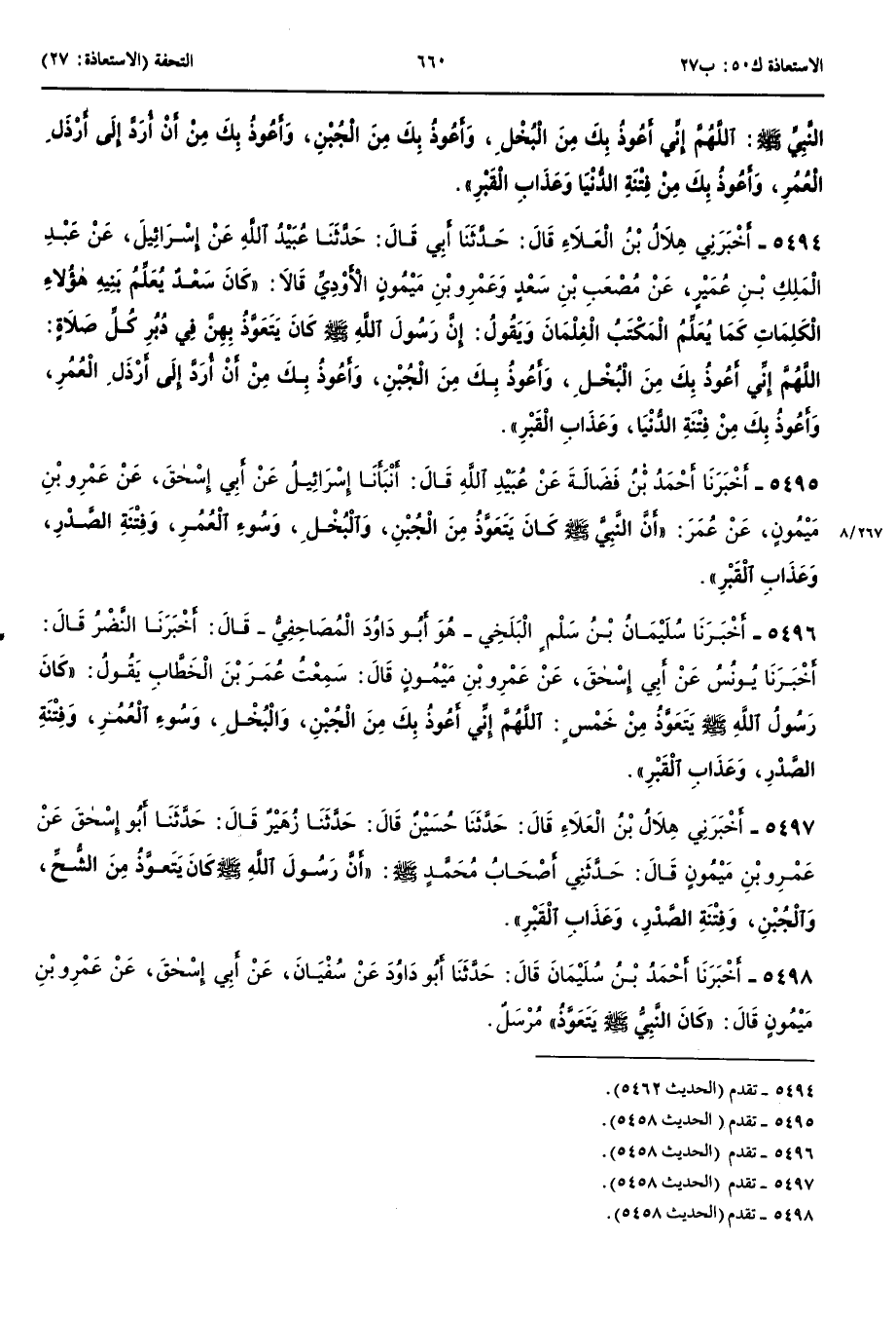 5498 - أَخْبَرَنَا أَحْمَدُ بْنُ سُلَيْمَانَ قَالَ حَدَّثَنَا أَبُو دَاوُدَ عَنْ سُفْيَانَ عَنْ أَبِي إِسْحَقَ عَنْ عَمْرِو بْنِ مَيْمُونٍ قَالَ كَانَ النَّبِيُّ صَلَّى اللَّهُ عَلَيْهِ وَسَلَّمَ يَتَعَوَّذُ مُرْسَلٌ