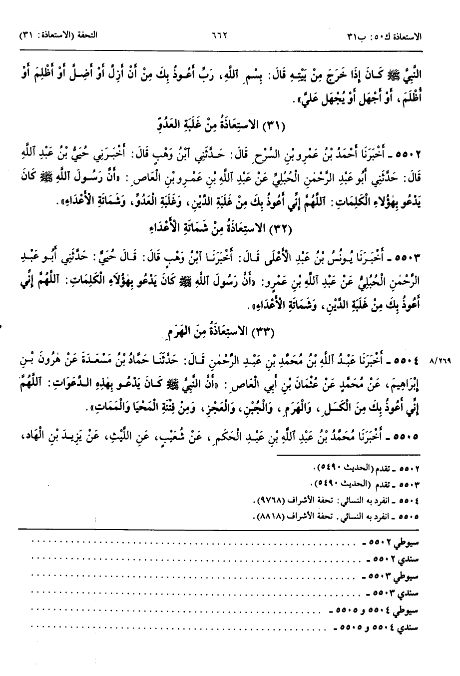 الِاسْتِعَاذَةُ مِنْ غَلَبَةِ الْعَدُوِّ 5502 - أَخْبَرَنَا أَحْمَدُ بْنُ عَمْرِو بْنِ السَّرْحِ قَالَ حَدَّثَنِي ابْنُ وَهْبٍ قَالَ أَخْبَرَنِي حُيَيُّ بْنُ عَبْدِ اللَّهِ قَالَ حَدَّثَنِي أَبُو عَبْدِ الرَّحْمَنِ الْحُبُلِيُّ عَنْ عَبْدِ اللَّهِ بْنِ عَمْرِو بْنِ الْعَاصِ أَنَّ رَسُولَ اللَّهِ صَلَّى اللَّهُ عَلَيْهِ وَسَلَّمَ كَانَ يَدْعُو بِهَؤُلَاءِ الْكَلِمَاتِ اللَّهُمَّ إِنِّي أَعُوذُ بِكَ مِنْ غَلَبَةِ الدَّيْنِ وَغَلَبَةِ الْعَدُوِّ وَشَمَاتَةِ الْأَعْدَاءِ