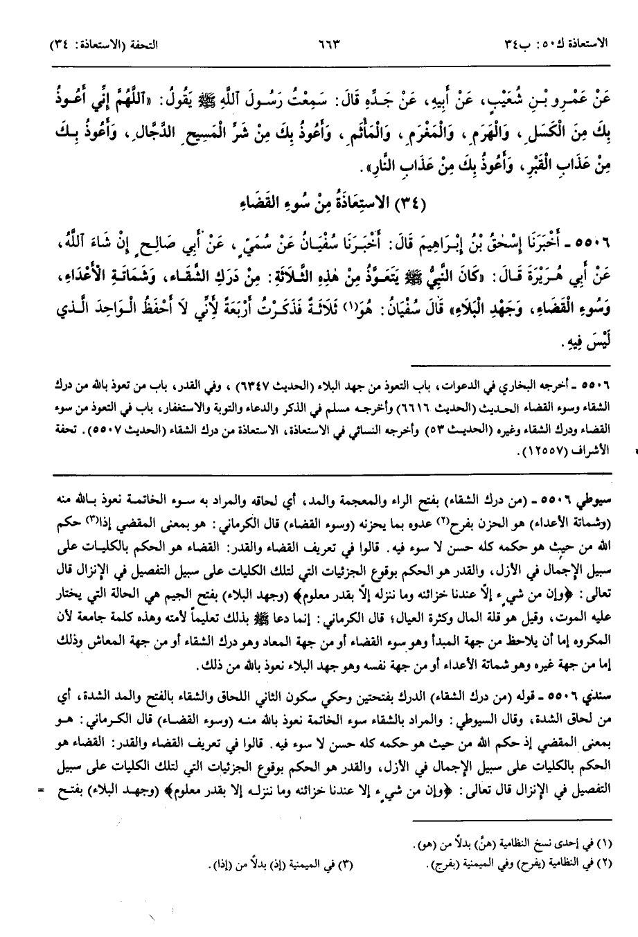 الِاسْتِعَاذَةُ مِنْ سُوءِ الْقَضَاءِ 5506 - أَخْبَرَنَا إِسْحَقُ بْنُ إِبْرَاهِيمَ قَالَ أَنْبَأَنَا سُفْيَانُ عَنْ سُمَيٍّ عَنْ أَبِي صَالِحٍ إِنْ شَاءَ اللَّهُ عَنْ أَبِي هُرَيْرَةَ قَالَ كَانَ النَّبِيُّ صَلَّى اللَّهُ عَلَيْهِ وَسَلَّمَ يَتَعَوَّذُ مِنْ هَذِهِ الثَّلَاثَةِ مِنْ دَرَكِ الشَّقَاءِ وَشَمَاتَةِ الْأَعْدَاءِ وَسُوءِ الْقَضَاءِ وَجَهْدِ الْبَلَاءِ قَالَ سُفْيَانُ هُوَ ثَلَاثَةٌ فَذَكَرْتُ أَرْبَعَةً لِأَنِّي لَا أَحْفَظُ الْوَاحِدَ الَّذِي لَيْسَ فِيهِ