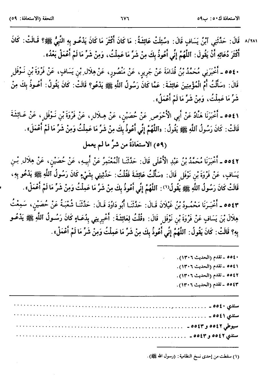5540 - أَخْبَرَنِي مُحَمَّدُ بْنُ قُدَامَةَ عَنْ جَرِيرٍ عَنْ مَنْصُورٍ عَنْ هِلَالِ بْنِ يَسَافٍ عَنْ فَرْوَةَ بْنِ نَوْفَلٍ قَالَ سَأَلْتُ أُمَّ الْمُؤْمِنِينَ عَائِشَةَ عَمَّا كَانَ رَسُولُ اللَّهِ صَلَّى اللَّهُ عَلَيْهِ وَسَلَّمَ يَدْعُو قَالَتْ كَانَ يَقُولُ أَعُوذُ بِكَ مِنْ شَرِّ مَا عَمِلْتُ وَمِنْ شَرِّ مَا لَمْ أَعْمَلْ