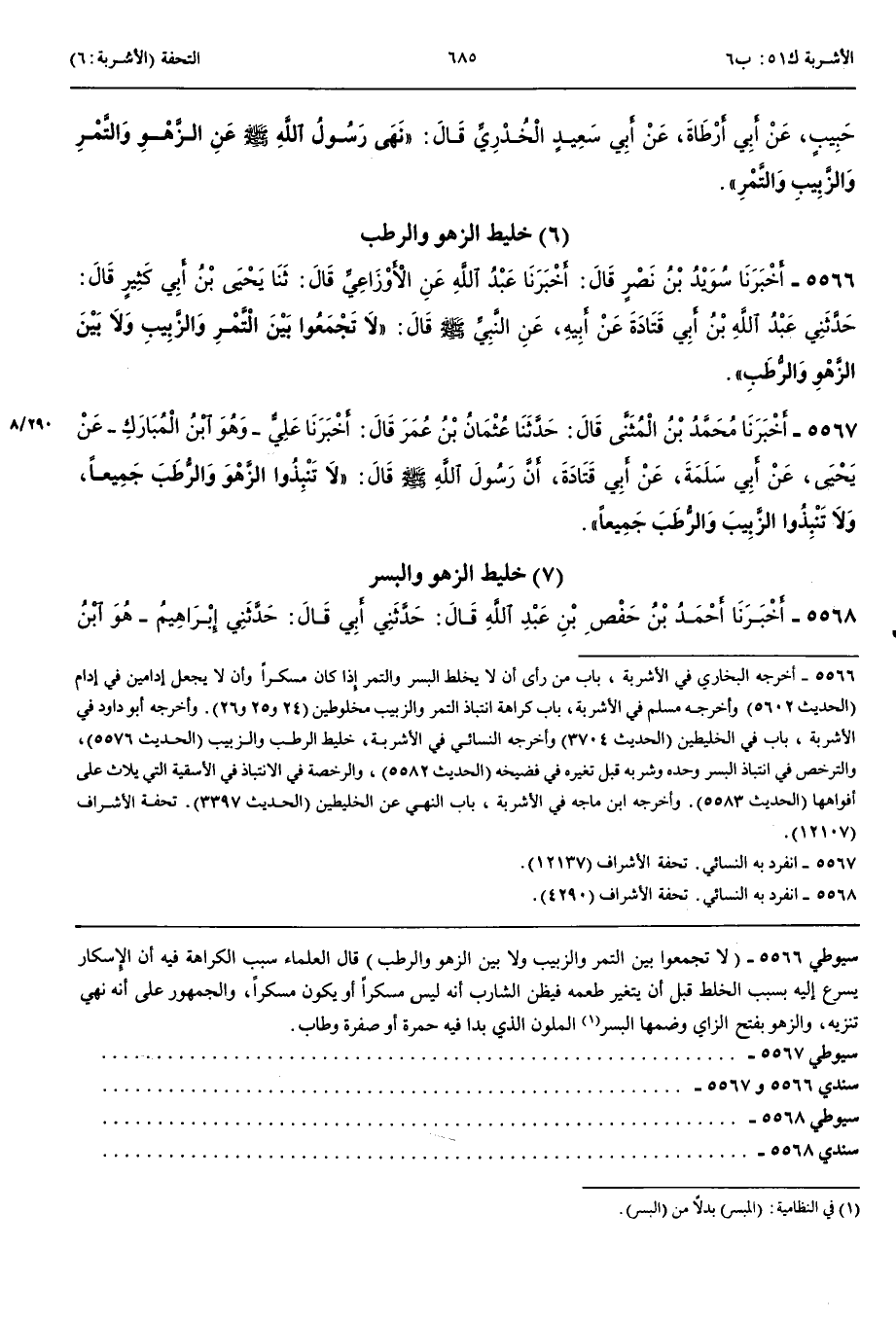 خَلِيطُ الزَّهْوِ وَالْبُسْرِ 5568 - أَخْبَرَنَا أَحْمَدُ بْنُ حَفْصِ بْنِ عَبْدِ اللَّهِ قَالَ حَدَّثَنِي أَبِي قَالَ حَدَّثَنِي إِبْرَاهِيمُ هُوَ ابْنُ طَهْمَانَ عَنْ عُمَرَ بْنِ سَعِيدٍ عَنْ سُلَيْمَانَ عَنْ مَالِكِ بْنِ الْحَارِثِ عَنْ أَبِي سَعِيدٍ الْخُدْرِيِّ قَالَ نَهَى رَسُولُ اللَّهِ صَلَّى اللَّهُ عَلَيْهِ وَسَلَّمَ أَنْ يُخْلَطَ التَّمْرُ وَالزَّبِيبُ وَأَنْ يُخْلَطَ الزَّهْوُ وَالتَّمْرُ وَالزَّهْوُ وَالْبُسْرُ