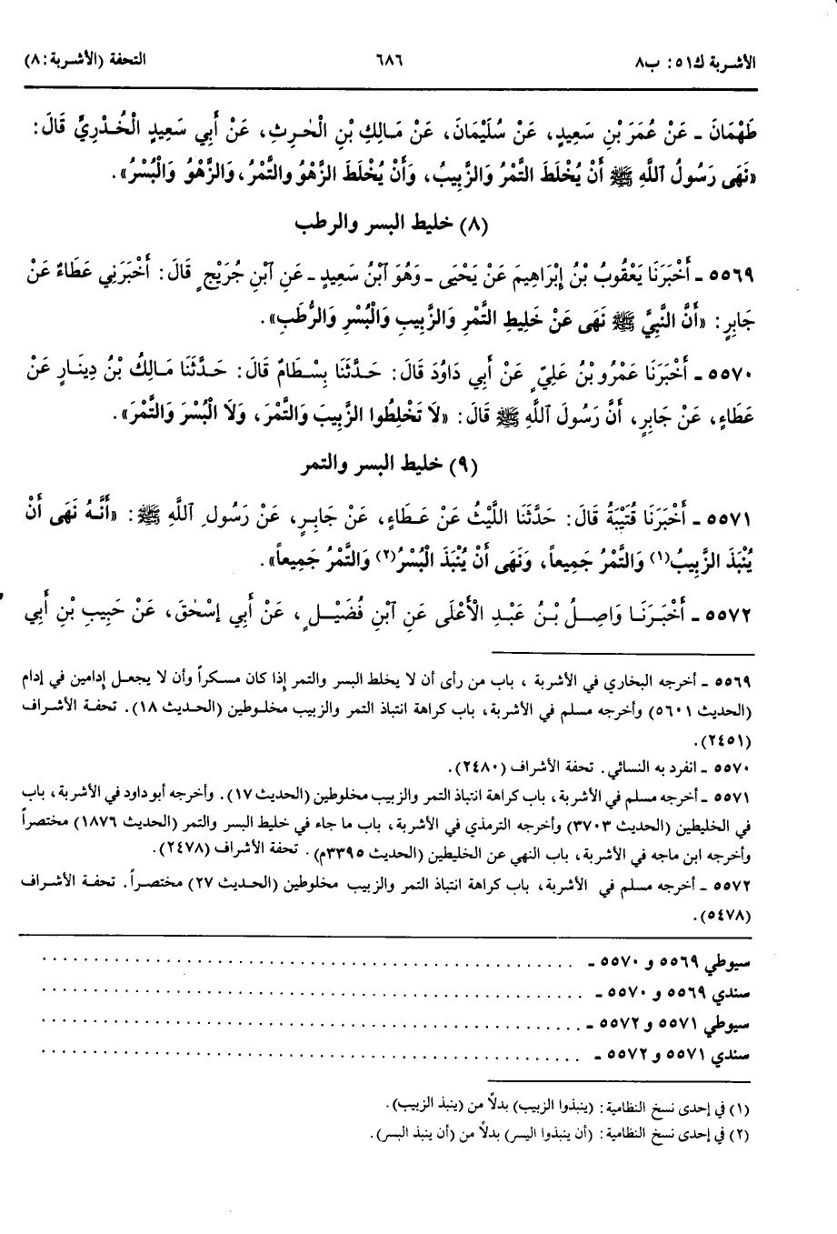 5572 - أَخْبَرَنَا وَاصِلُ بْنُ عَبْدِ الْأَعْلَى عَنْ ابْنِ فُضَيْلٍ عَنْ أَبِي إِسْحَقَ عَنْ حَبِيبِ بْنِ أَبِي ثَابِتٍ عَنْ سَعِيدِ بْنِ جُبَيْرٍ عَنْ ابْنِ عَبَّاسٍ قَالَ نَهَى رَسُولُ اللَّهِ صَلَّى اللَّهُ عَلَيْهِ وَسَلَّمَ عَنْ الدُّبَّاءِ وَالْحَنْتَمِ وَالْمُزَفَّتِ وَالنَّقِيرِ وَعَنْ الْبُسْرِ وَالتَّمْرِ أَنْ يُخْلَطَا وَعَنْ الزَّبِيبِ وَالتَّمْرِ أَنْ يُخْلَطَا وَكَتَبَ إِلَى أَهْلِ هَجَرَ أَنْ لَا تَخْلِطُوا الزَّبِيبَ وَالتَّمْرَ جَمِيعًا