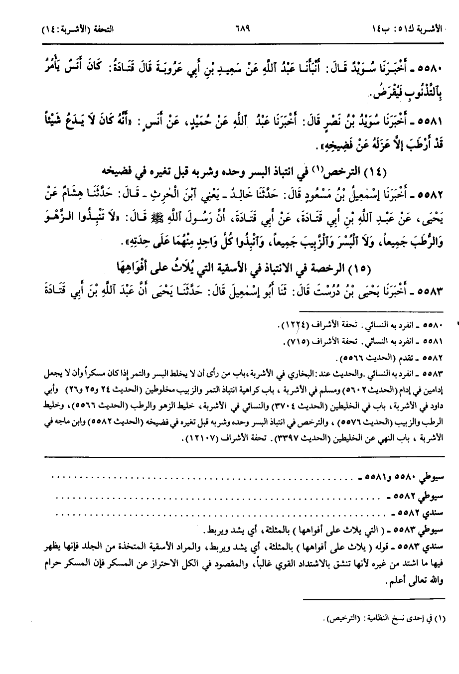 5581 - أَخْبَرَنَا سُوَيْدُ بْنُ نَصْرٍ قَالَ أَنْبَأَنَا عَبْدُ اللَّهِ عَنْ حُمَيْدٍ عَنْ أَنَسٍ أَنَّهُ كَانَ لَا يَدَعُ شَيْئًا قَدْ أَرْطَبَ إِلَّا عَزَلَهُ عَنْ فَضِيخِهِ