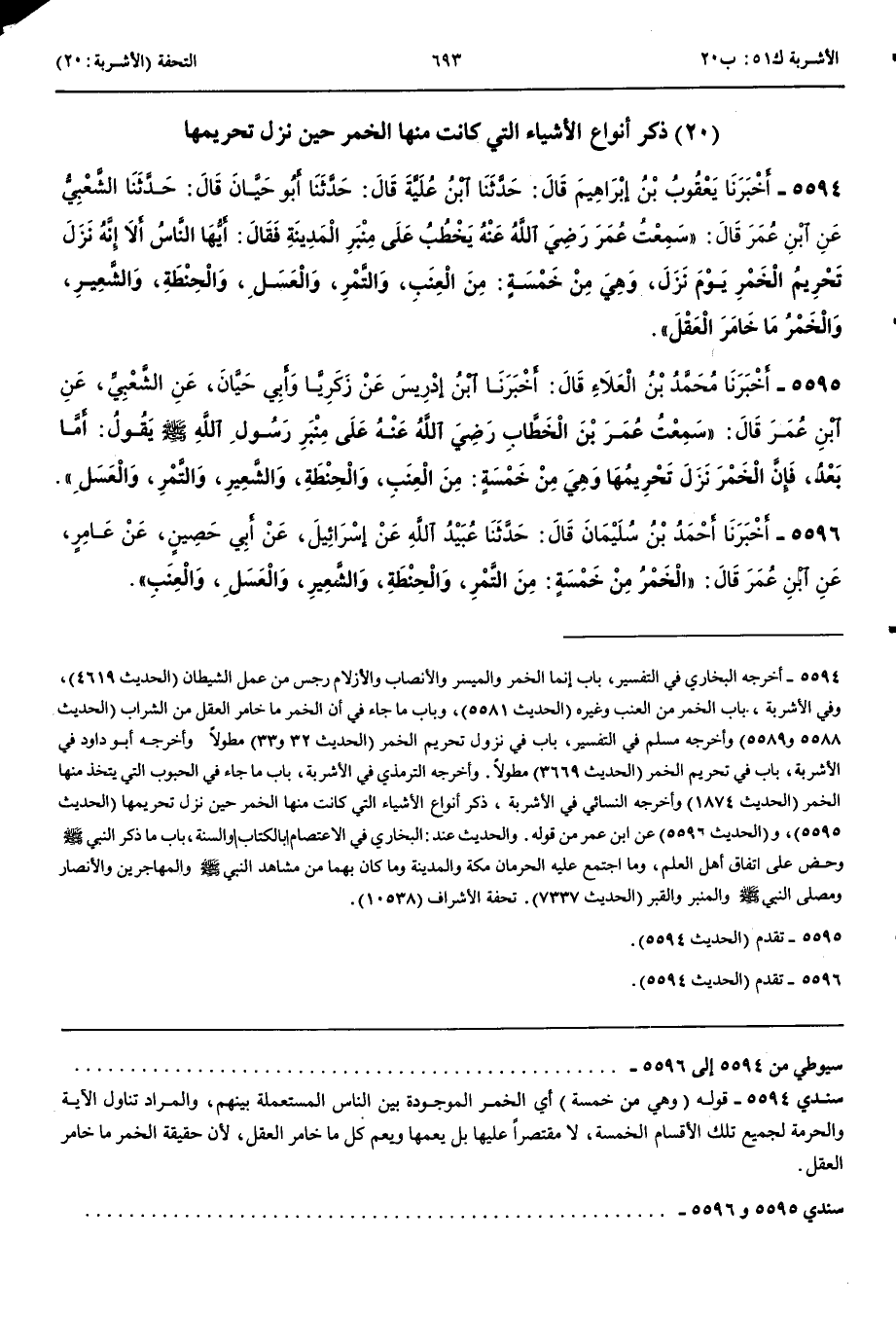 5595 - أَخْبَرَنَا مُحَمَّدُ بْنُ الْعَلَاءِ قَالَ أَنْبَأَنَا ابْنُ إِدْرِيسَ عَنْ زَكَرِيَّا وَأَبِي حَيَّانَ عَنْ الشَّعْبِيِّ عَنْ ابْنِ عُمَرَ قَالَ سَمِعْتُ عُمَرَ بْنَ الْخَطَّابِ رَضِيَ اللَّهُ عَنْهُ عَلَى مِنْبَرِ رَسُولِ اللَّهِ صَلَّى اللَّهُ عَلَيْهِ وَسَلَّمَ يَقُولُ أَمَّا بَعْدُ فَإِنَّ الْخَمْرَ نَزَلَ تَحْرِيمُهَا وَهِيَ مِنْ خَمْسَةٍ مِنْ الْعِنَبِ وَالْحِنْطَةِ وَالشَّعِيرِ وَالتَّمْرِ وَالْعَسَلِ