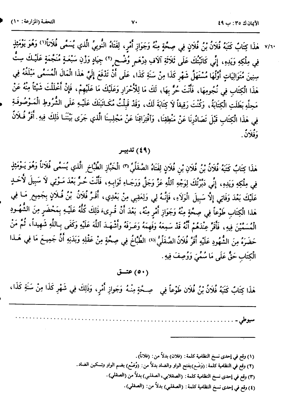 عِتْقٌ هَذَا كِتَابٌ كَتَبَهُ فُلَانُ بْنُ فُلَانٍ طَوْعًا فِي صِحَّةٍ مِنْهُ وَجَوَازِ أَمْرٍ وَذَلِكَ فِي شَهْرِ كَذَا مِنْ سَنَةِ كَذَا لِفَتَاهُ الرُّومِيِّ الَّذِي يُسَمَّى فُلَانًا وَهُوَ يَوْمَئِذٍ فِي مِلْكِهِ وَيَدِهِ إِنِّي أَعْتَقْتُكَ تَقَرُّبًا إِلَى اللَّهِ عَزَّ وَجَلَّ وَابْتِغَاءً لِجَزِيلِ ثَوَابِهِ عِتْقًا بَتًّا لَا مَثْنَوِيَّةَ فِيهِ وَلَا رَجْعَةَ لِي عَلَيْكَ فَأَنْتَ حُرٌّ لِوَجْهِ اللَّهِ وَالدَّارِ الْآخِرَةِ لَا سَبِيلَ لِي وَلَا لِأَحَدٍ عَلَيْكَ إِلَّا الْوَلَاءَ فَإِنَّهُ لِي وَلِعَصَبَتِي مِنْ بَعْدِي