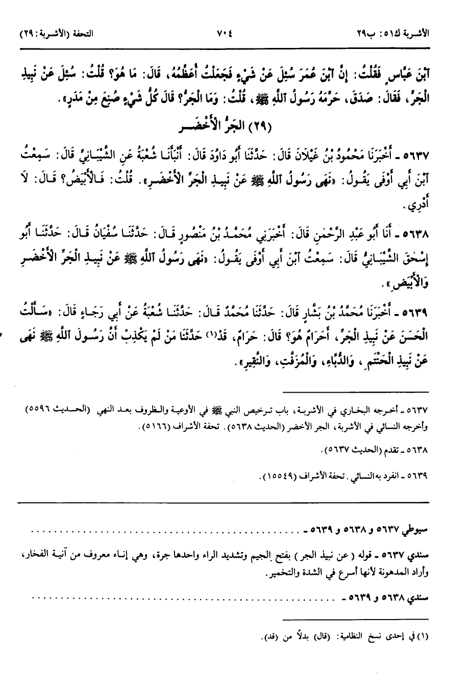 الْجَرُّ الْأَخْضَرُ 5637 - أَخْبَرَنَا مَحْمُودُ بْنُ غَيْلَانَ قَالَ حَدَّثَنَا أَبُو دَاوُدَ قَالَ أَنْبَأَنَا شُعْبَةُ عَنْ الشَّيْبَانِيِّ قَالَ سَمِعْتُ ابْنَ أَبِي أَوْفَى يَقُولُ نَهَى رَسُولُ اللَّهِ صَلَّى اللَّهُ عَلَيْهِ وَسَلَّمَ عَنْ نَبِيذِ الْجَرِّ الْأَخْضَرِ قُلْتُ فَالْأَبْيَضُ قَالَ لَا أَدْرِي