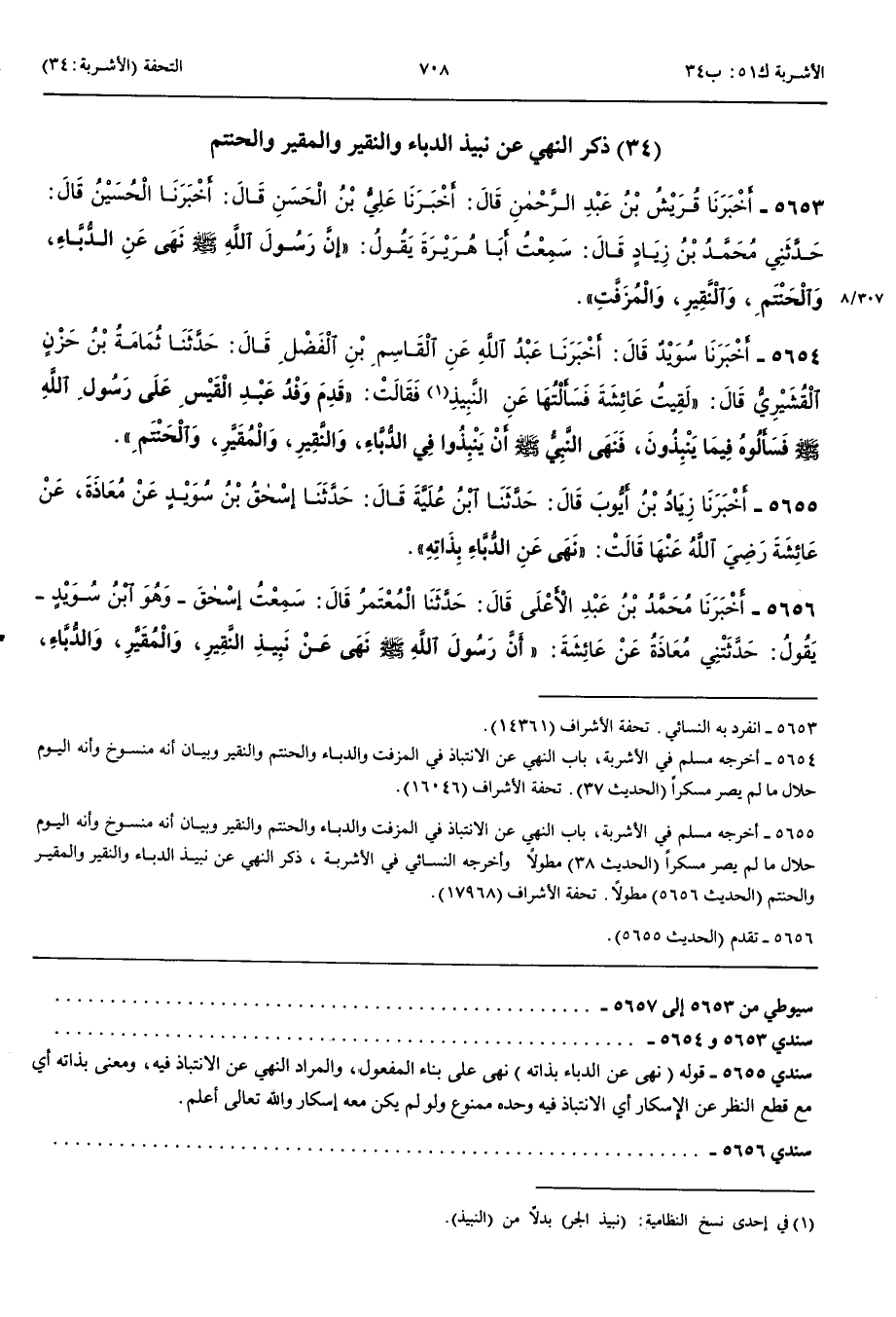 5654 - أَخْبَرَنَا سُوَيْدٌ قَالَ أَنْبَأَنَا عَبْدُ اللَّهِ عَنْ الْقَاسِمِ بْنِ الْفَضْلِ قَالَ حَدَّثَنَا ثُمَامَةُ بْنُ حَزْنٍ الْقُشَيْرِيُّ قَالَ لَقِيتُ عَائِشَةَ فَسَأَلْتُهَا عَنْ النَّبِيذِ فَقَالَتْ قَدِمَ وَفْدُ عَبْدِ الْقَيْسِ عَلَى رَسُولِ اللَّهِ صَلَّى اللَّهُ عَلَيْهِ وَسَلَّمَ فَسَأَلُوهُ فِيمَا يَنْبِذُونَ فَنَهَى النَّبِيُّ صَلَّى اللَّهُ عَلَيْهِ وَسَلَّمَ أَنْ يَنْبِذُوا فِي الدُّبَّاءِ وَالنَّقِيرِ وَالْمُقَيَّرِ وَالْحَنْتَمِ