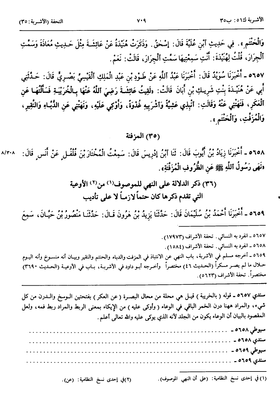 الْمُزَفَّتَةُ 5658 - أَخْبَرَنَا زِيَادُ بْنُ أَيُّوبَ قَالَ حَدَّثَنَا ابْنُ إِدْرِيسَ قَالَ سَمِعْتُ الْمُخْتَارَ بْنَ فُلْفُلٍ عَنْ أَنَسٍ قَالَ نَهَى رَسُولُ اللَّهِ صَلَّى اللَّهُ عَلَيْهِ وَسَلَّمَ عَنْ الظُّرُوفِ الْمُزَفَّتَةِ