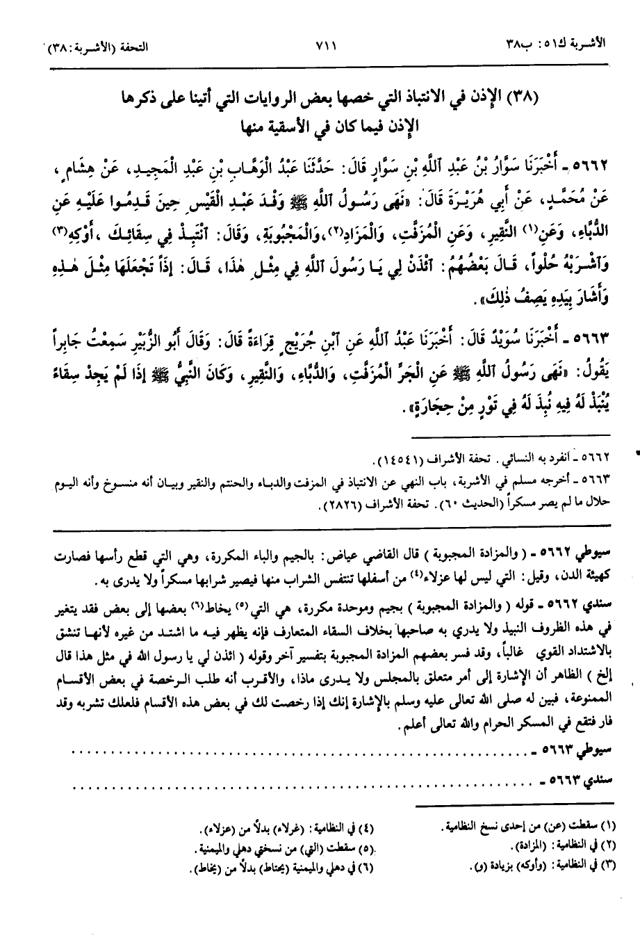 الْإِذْنُ فِي الِانْتِبَاذِ الَّتِي خَصَّهَا بَعْضُ الرِّوَايَاتِ الَّتِي أَتَيْنَا عَلَى ذِكْرِهَا الْإِذْنِ فِيمَا كَانَ فِي الْأَسْقِيَةِ مِنْهَا 5662 - أَخْبَرَنَا سَوَّارُ بْنُ عَبْدِ اللَّهِ بْنِ سَوَّارٍ قَالَ حَدَّثَنَا عَبْدُ الْوَهَّابِ بْنِ عَبْدِ الْمَجِيدِ عَنْ هِشَامٍ عَنْ مُحَمَّدٍ عَنْ أَبِي هُرَيْرَةَ قَالَ نَهَى رَسُولُ اللَّهِ صَلَّى اللَّهُ عَلَيْهِ وَسَلَّمَ وَفْدَ عَبْدِ الْقَيْسِ حِينَ قَدِمُوا عَلَيْهِ عَنْ الدُّبَّاءِ وَعَنْ النَّقِيرِ وَعَنْ الْمُزَفَّتِ وَالْمَزَادَةِ الْمَجْبُوبَةِ وَقَالَ انْتَبِذْ فِي سِقَائِكَ أَوْكِهِ وَاشْرَبْهُ حُلْوًا قَالَ بَعْضُهُمْ ائْذَنْ لِي يَا رَسُولَ اللَّهِ فِي مِثْلِ هَذَا قَالَ إِذًا تَجْعَلَهَا مِثْلَ هَذِهِ وَأَشَارَ بِيَدِهِ يَصِفُ ذَلِكَ