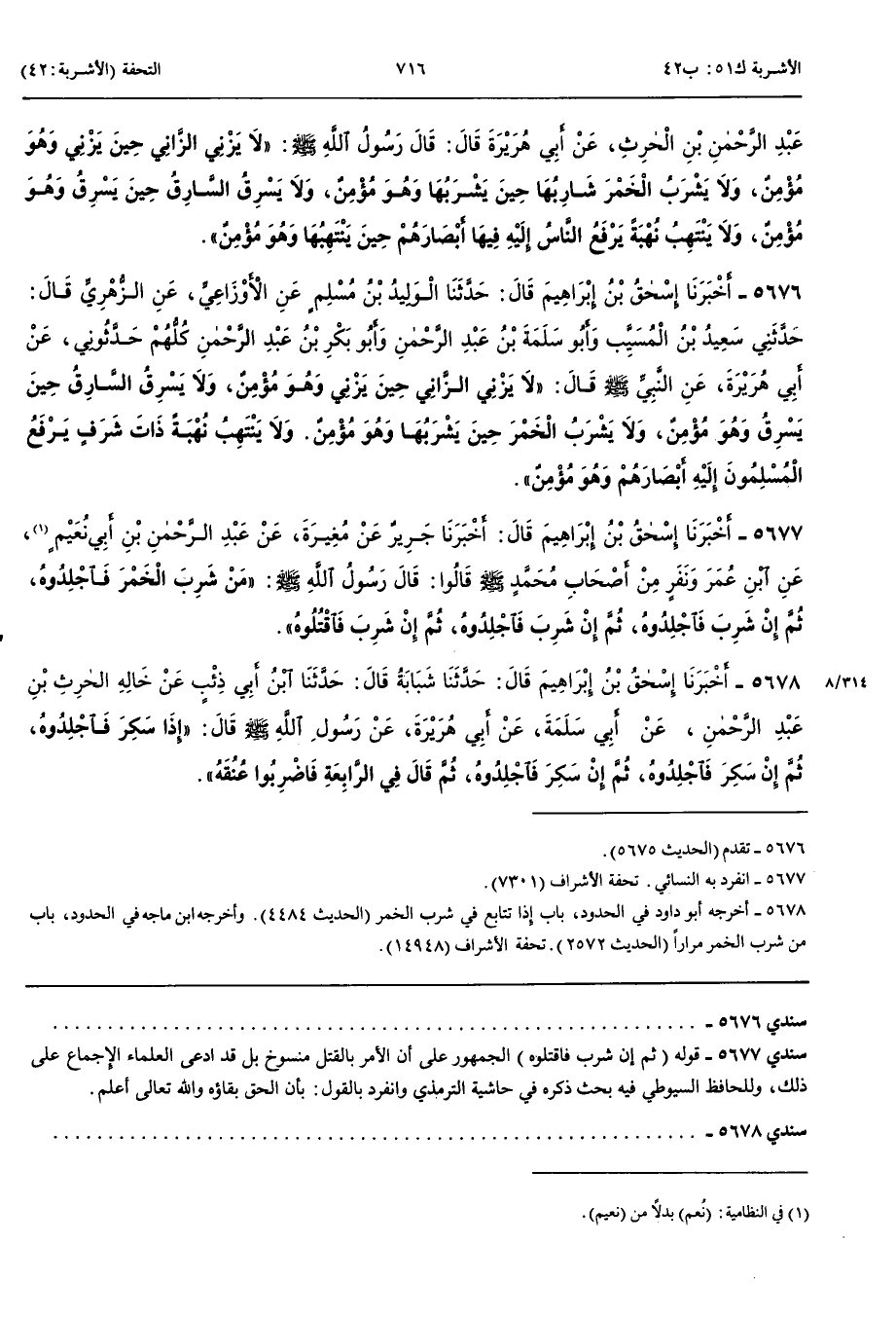 5676 - أَخْبَرَنَا إِسْحَقُ بْنُ إِبْرَاهِيمَ قَالَ حَدَّثَنَا الْوَلِيدُ بْنُ مُسْلِمٍ عَنْ الْأَوْزَاعِيِّ عَنْ الزُّهْرِيِّ قَالَ حَدَّثَنِي سَعِيدُ بْنُ الْمُسَيَّبِ وَأَبُو سَلَمَةَ بْنُ عَبْدِ الرَّحْمَنِ وَأَبُو بَكْرِ بْنُ عَبْدِ الرَّحْمَنِ كُلُّهُمْ حَدَّثُونِي عَنْ أَبِي هُرَيْرَةَ عَنْ النَّبِيِّ صَلَّى اللَّهُ عَلَيْهِ وَسَلَّمَ قَالَ لَا يَزْنِي الزَّانِي حِينَ يَزْنِي وَهُوَ مُؤْمِنٌ وَلَا يَسْرِقُ السَّارِقُ حِينَ يَسْرِقُ وَهُوَ مُؤْمِنٌ وَلَا يَشْرَبُ الْخَمْرَ حِينَ يَشْرَبُهَا وَهُوَ مُؤْمِنٌ وَلَا يَنْتَهِبُ نُهْبَةً ذَاتَ شَرَفٍ يَرْفَعُ الْمُسْلِمُونَ إِلَيْهِ أَبْصَارَهُمْ وَهُوَ مُؤْمِنٌ