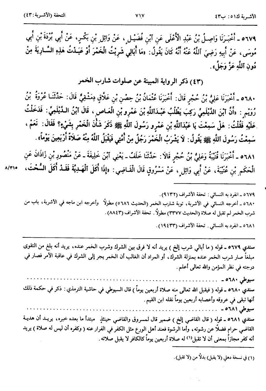 5681 - أَخْبَرَنَا قُتَيْبَةُ وَعَلِيُّ بْنُ حُجْرٍ قَالَا حَدَّثَنَا خَلَفٌ يَعْنِي ابْنَ خَلِيفَةَ عَنْ مَنْصُورِ بْنِ زَاذَانَ عَنْ الْحَكَمِ بْنِ عُتَيْبَةَ عَنْ أَبِي وَائِلٍ عَنْ مَسْرُوقٍ قَالَ الْقَاضِي إِذَا أَكَلَ الْهَدِيَّةَ فَقَدْ أَكَلَ السُّحْتَ وَإِذَا قَبِلَ الرِّشْوَةَ بَلَغَتْ بِهِ الْكُفْرَ وَقَالَ مَسْرُوقٌ مَنْ شَرِبَ الْخَمْرَ فَقَدْ كَفَرَ وَكُفْرُهُ أَنْ لَيْسَ لَهُ صَلَاةٌ