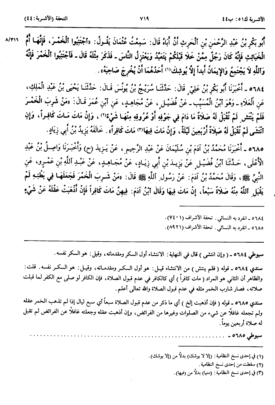 5685 - أَخْبَرَنِي مُحَمَّدُ بْنُ آدَمَ بْنِ سُلَيْمَانَ عَنْ عَبْدِ الرَّحِيمِ عَنْ يَزِيدَ ح وَأَنْبَأَنَا وَاصِلُ بْنُ عَبْدِ الْأَعْلَى حَدَّثَنَا ابْنُ فُضَيْلٍ عَنْ يَزِيدَ بْنِ أَبِي زِيَادٍ عَنْ مُجَاهِدٍ عَنْ عَبْدِ اللَّهِ بْنِ عَمْرٍو عَنْ النَّبِيِّ صَلَّى اللَّهُ عَلَيْهِ وَسَلَّمَ وَقَالَ مُحَمَّدُ بْنُ آدَمَ عَنْ رَسُولِ اللَّهِ صَلَّى اللَّهُ عَلَيْهِ وَسَلَّمَ قَالَ مَنْ شَرِبَ الْخَمْرَ فَجَعَلَهَا فِي بَطْنِهِ لَمْ يَقْبَلْ اللَّهُ مِنْهُ صَلَاةً سَبْعًا إِنْ مَاتَ فِيهَا وَقَالَ ابْنُ آدَمَ فِيهِنَّ مَاتَ كَافِرًا فَإِنْ أَذْهَبَتْ عَقْلَهُ عَنْ شَيْءٍ مِنْ الْفَرَائِضِ وَقَالَ ابْنُ آدَمَ الْقُرْآنِ لَمْ تُقْبَلْ لَهُ صَلَاةٌ أَرْبَعِينَ يَوْمًا إِنْ مَاتَ فِيهَا وَقَالَ ابْنُ آدَمَ فِيهِنَّ مَاتَ كَافِرًا