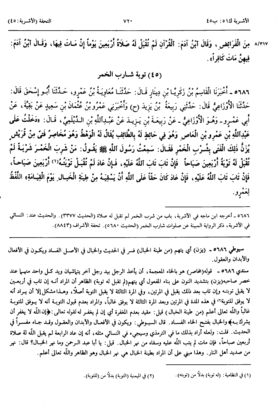 تَوْبَةُ شَارِبِ الْخَمْرِ 5686 - أَخْبَرَنَا الْقَاسِمُ بْنُ زَكَرِيَّا بْنِ دِينَارٍ قَالَ حَدَّثَنَا مُعَاوِيَةُ بْنُ عَمْرٍو حَدَّثَنَا أَبُو إِسْحَقَ قَالَ حَدَّثَنَا الْأَوْزَاعِيُّ قَالَ حَدَّثَنِي رَبِيعَةُ بْنُ يَزِيدَ ح و أَخْبَرَنِي عَمْرُو بْنُ عُثْمَانَ بْنِ سَعِيدٍ عَنْ بَقِيَّةَ عَنْ أَبِي عَمْرٍو وَهُوَ الْأَوْزَاعِيُّ عَنْ رَبِيعَةَ بْنِ يَزِيدَ عَنْ عَبْدِ اللَّهِ بْنِ الدَّيْلَمِيِّ قَالَ دَخَلْتُ عَلَى عَبْدِ اللَّهِ بْنِ عَمْرِو بْنِ الْعَاصِ وَهُوَ فِي حَائِطٍ لَهُ بِالطَّائِفِ يُقَالُ لَهُ الْوَهْطُ وَهُوَ مُخَاصِرٌ فَتًى مِنْ قُرَيْشٍ يُزَنُّ ذَلِكَ الْفَتَى بِشُرْبِ الْخَمْرِ فَقَالَ سَمِعْتُ رَسُولَ اللَّهِ صَلَّى اللَّهُ عَلَيْهِ وَسَلَّمَ يَقُولُ مَنْ شَرِبَ الْخَمْرَ شَرْبَةً لَمْ تُقْبَلْ لَهُ تَوْبَةٌ أَرْبَعِينَ صَبَاحًا فَإِنْ تَابَ تَابَ اللَّهُ عَلَيْهِ فَإِنْ عَادَ لَمْ تُقْبَلْ تَوْبَتُهُ أَرْبَعِينَ صَبَاحًا فَإِنْ تَابَ تَابَ اللَّهُ عَلَيْهِ فَإِنْ عَادَ كَانَ حَقًّا عَلَى اللَّهِ أَنْ يَسْقِيَهُ مِنْ طِينَةِ الْخَبَالِ يَوْمَ الْقِيَامَةِ اللَّفْظُ لِعَمْرٍو