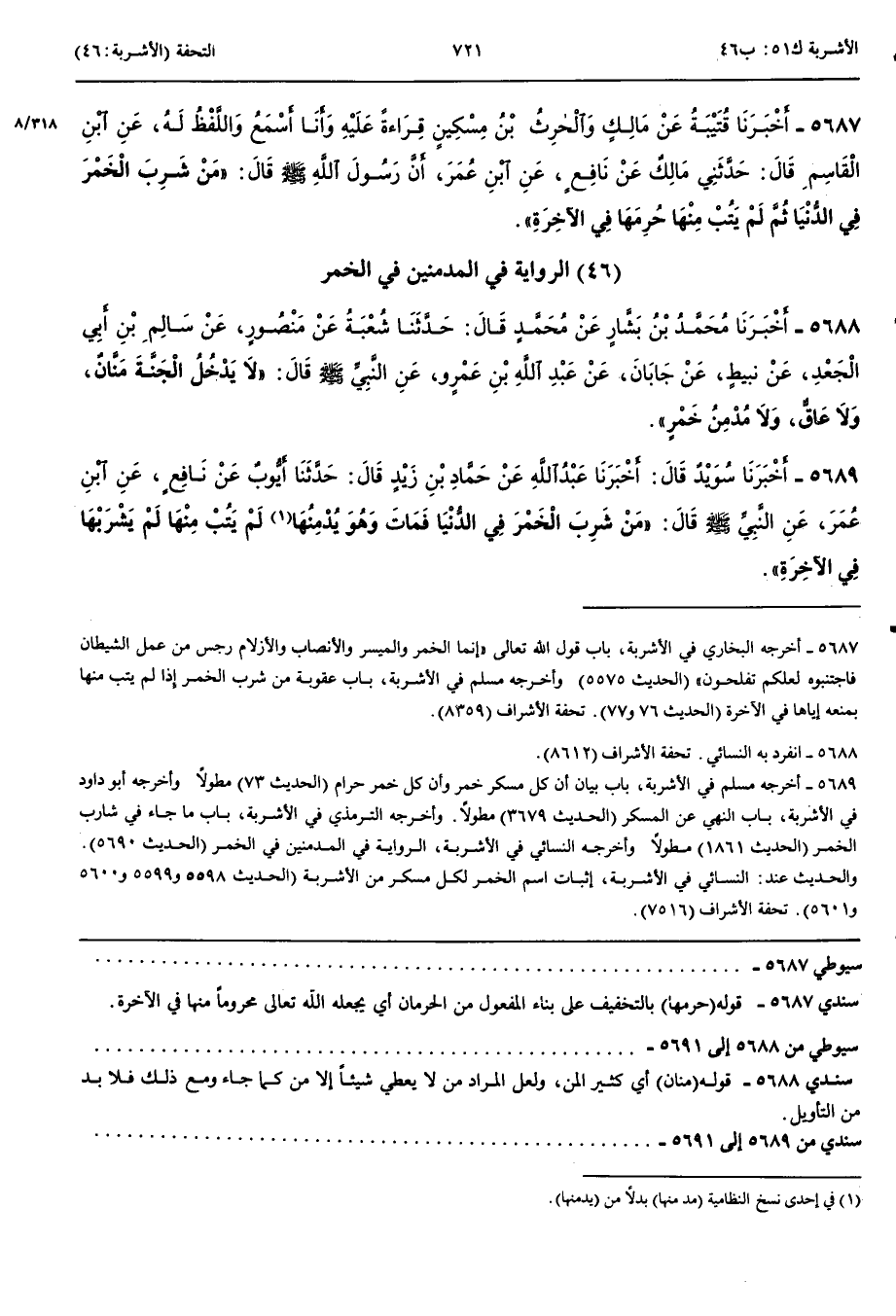 5689 - أَخْبَرَنَا سُوَيْدٌ قَالَ أَنْبَأَنَا عَبْدُ اللَّهِ عَنْ حَمَّادِ بْنِ زَيْدٍ قَالَ حَدَّثَنَا أَيُّوبُ عَنْ نَافِعٍ عَنْ ابْنِ عُمَرَ عَنْ النَّبِيِّ صَلَّى اللَّهُ عَلَيْهِ وَسَلَّمَ قَالَ مَنْ شَرِبَ الْخَمْرَ فِي الدُّنْيَا فَمَاتَ وَهُوَ يُدْمِنُهَا لَمْ يَتُبْ مِنْهَا لَمْ يَشْرَبْهَا فِي الْآخِرَةِ