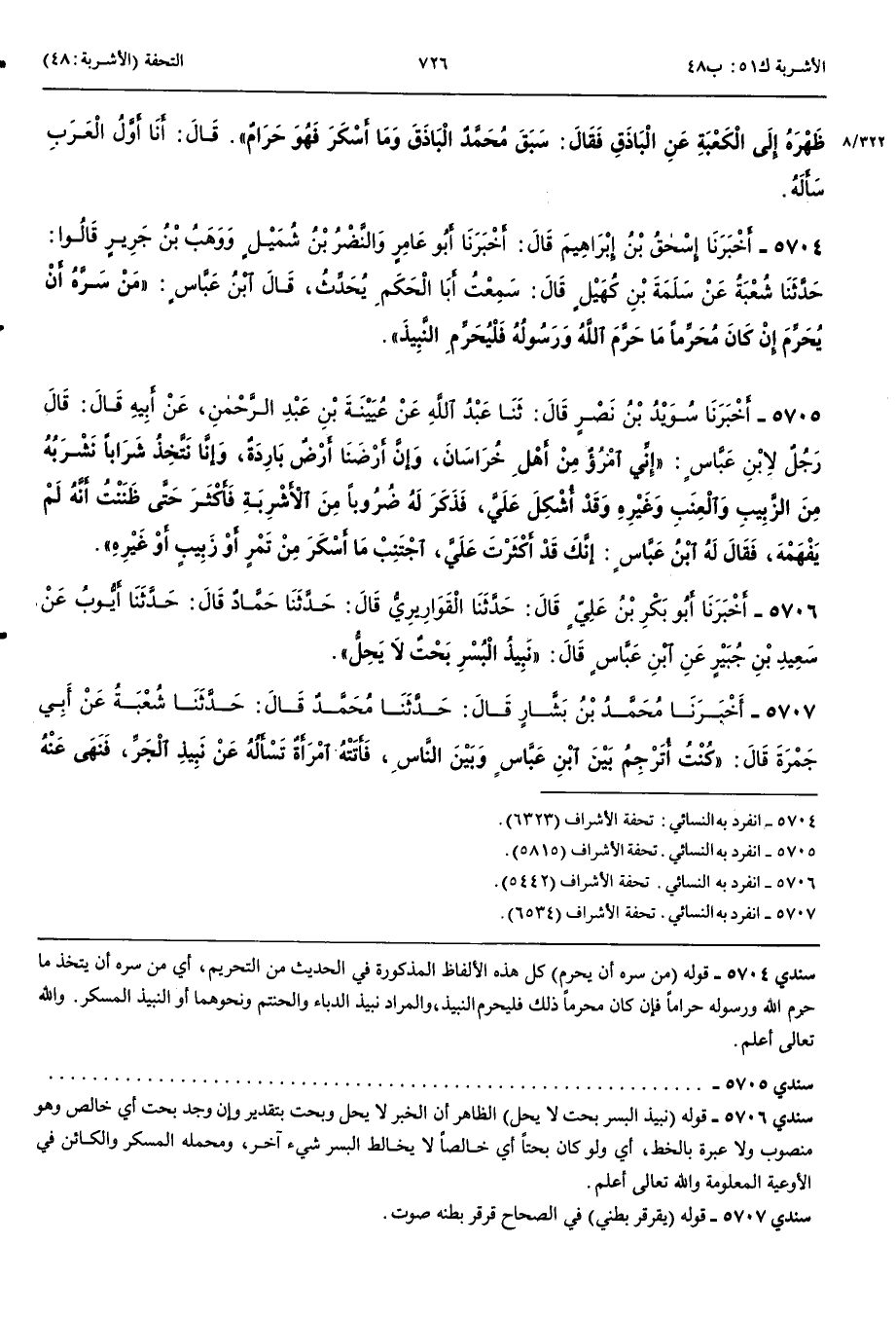 5704 - أَخْبَرَنَا إِسْحَقُ بْنُ إِبْرَاهِيمَ قَالَ أَنْبَأَنَا أَبُو عَامِرٍ وَالنَّضْرُ بْنُ شُمَيْلٍ وَوَهْبُ بْنُ جَرِيرٍ قَالُوا حَدَّثَنَا شُعْبَةُ عَنْ سَلَمَةَ بْنِ كُهَيْلٍ قَالَ سَمِعْتُ أَبَا الْحَكَمِ يُحَدِّثُ قَالَ ابْنُ عَبَّاسٍ مَنْ سَرَّهُ أَنْ يُحَرِّمَ إِنْ كَانَ مُحَرِّمًا مَا حَرَّمَ اللَّهُ وَرَسُولُهُ فَلْيُحَرِّمْ النَّبِيذَ
