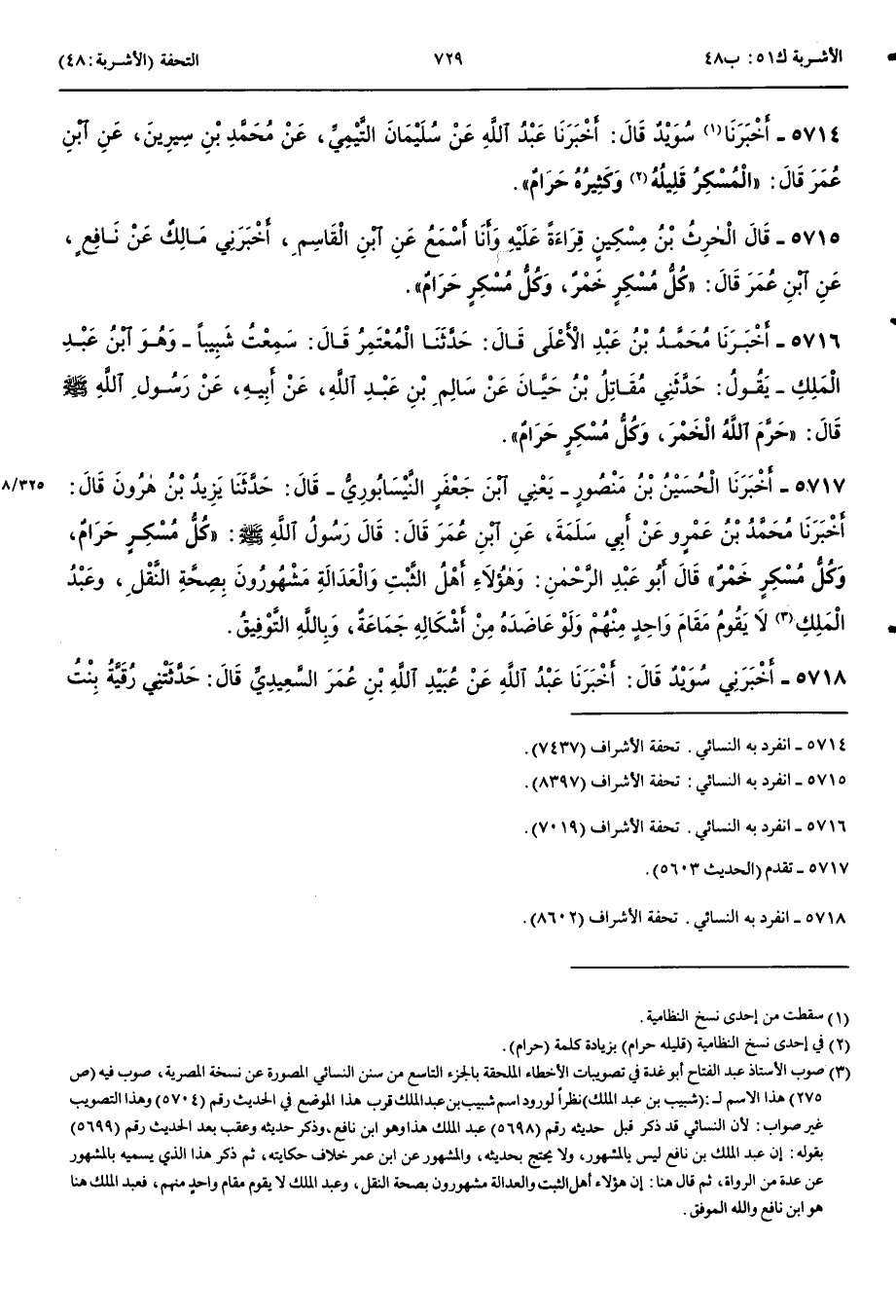 5717 - أَخْبَرَنَا الْحُسَيْنُ بْنُ مَنْصُورٍ يَعْنِي ابْنَ جَعْفَرٍ النَّيْسَابُورِيَّ قَالَ حَدَّثَنَا يَزِيدُ بْنُ هَارُونَ قَالَ أَنْبَأَنَا مُحَمَّدُ بْنُ عَمْرٍو عَنْ أَبِي سَلَمَةَ عَنْ ابْنِ عُمَرَ قَالَ قَالَ رَسُولُ اللَّهِ صَلَّى اللَّهُ عَلَيْهِ وَسَلَّمَ كُلُّ مُسْكِرٍ حَرَامٌ وَكُلُّ مُسْكِرٍ خَمْرٌ قَالَ أَبُو عَبْد الرَّحْمَنِ وَهَؤُلَاءِ أَهْلُ الثَّبْتِ وَالْعَدَالَةِ مَشْهُورُونَ بِصِحَّةِ النَّقْلِ وَعَبْدُ الْمَلِكِ لَا يَقُومُ مَقَامَ وَاحِدٍ مِنْهُمْ وَلَوْ عَاضَدَهُ مِنْ أَشْكَالِهِ جَمَاعَةٌ وَبِاللَّهِ التَّوْفِيقُ