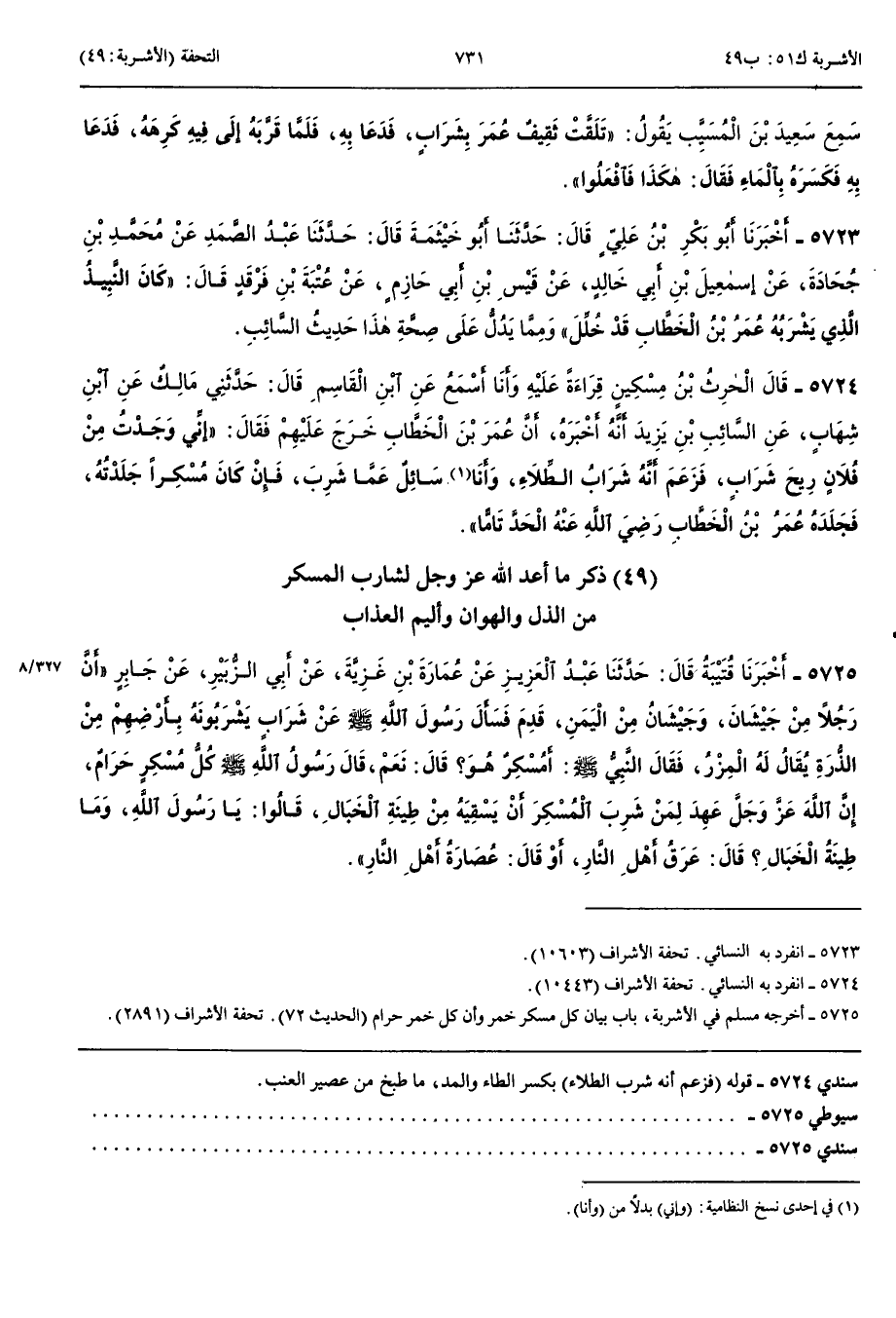 5723 - أَخْبَرَنَا أَبُو بَكْرِ بْنُ عَلِيٍّ قَالَ حَدَّثَنَا أَبُو خَيْثَمَةَ قَالَ حَدَّثَنَا عَبْدُ الصَّمَدِ عَنْ أَبِيهِ عَنْ مُحَمَّدِ بْنِ جُحَادَةَ عَنْ إِسْمَعِيلَ بْنِ أَبِي خَالِدٍ عَنْ قَيْسِ بْنِ أَبِي حَازِمٍ عَنْ عُتْبَةَ بْنِ فَرْقَدٍ قَالَ كَانَ النَّبِيذُ الَّذِي يَشْرَبُهُ عُمَرُ بْنُ الْخَطَّابِ قَدْ خُلِّلَ وَمِمَّا يَدُلُّ عَلَى صِحَّةِ هَذَا حَدِيثُ السَّائِبِ