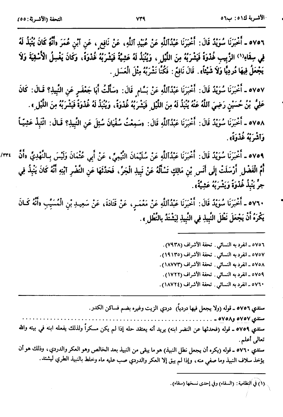 5759 - أَخْبَرَنَا سُوَيْدٌ قَالَ أَنْبَأَنَا عَبْدُ اللَّهِ عَنْ سُلَيْمَانَ التَّيْمِيِّ عَنْ أَبِي عُثْمَانَ وَلَيْسَ بِالنَّهْدِيِّ أَنَّ أُمَّ الْفَضْلِ أَرْسَلَتْ إِلَى أَنَسِ بْنِ مَالِكٍ تَسْأَلُهُ عَنْ نَبِيذِ الْجَرِّ فَحَدَّثَهَا عَنْ النَّضْرِ ابْنِهِ أَنَّهُ كَانَ يَنْبِذُ فِي جَرٍّ يُنْبَذُ غَدْوَةً وَيَشْرَبُهُ عَشِيَّةً