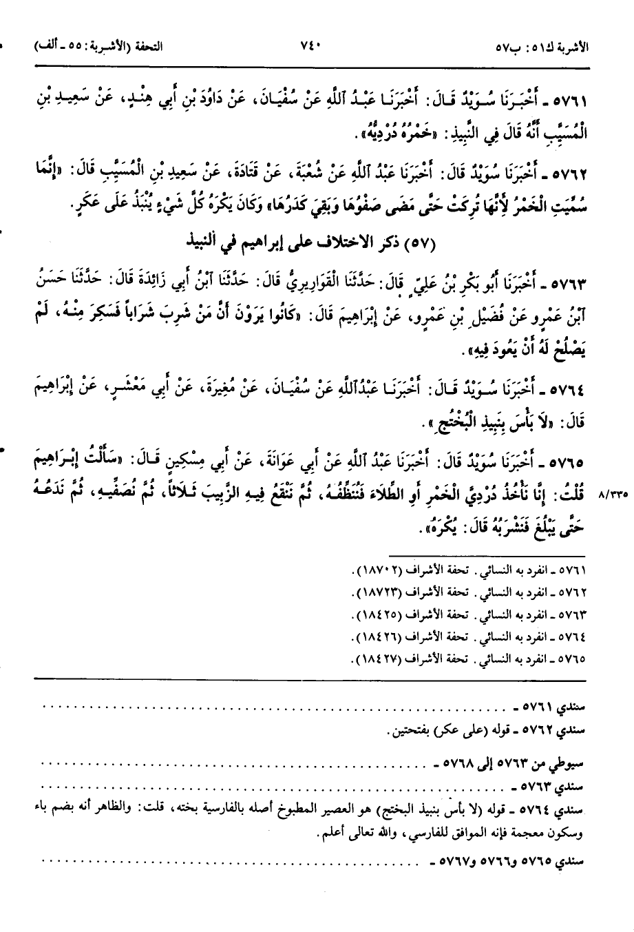 5761 - أَخْبَرَنَا سُوَيْدٌ قَالَ أَنْبَأَنَا عَبْدُ اللَّهِ عَنْ سُفْيَانَ عَنْ دَاوُدَ بْنِ أَبِي هِنْدٍ عَنْ سَعِيدِ بْنِ الْمُسَيَّبِ أَنَّهُ قَالَ فِي النَّبِيذِ خَمْرُهُ دُرْدِيُّهُ