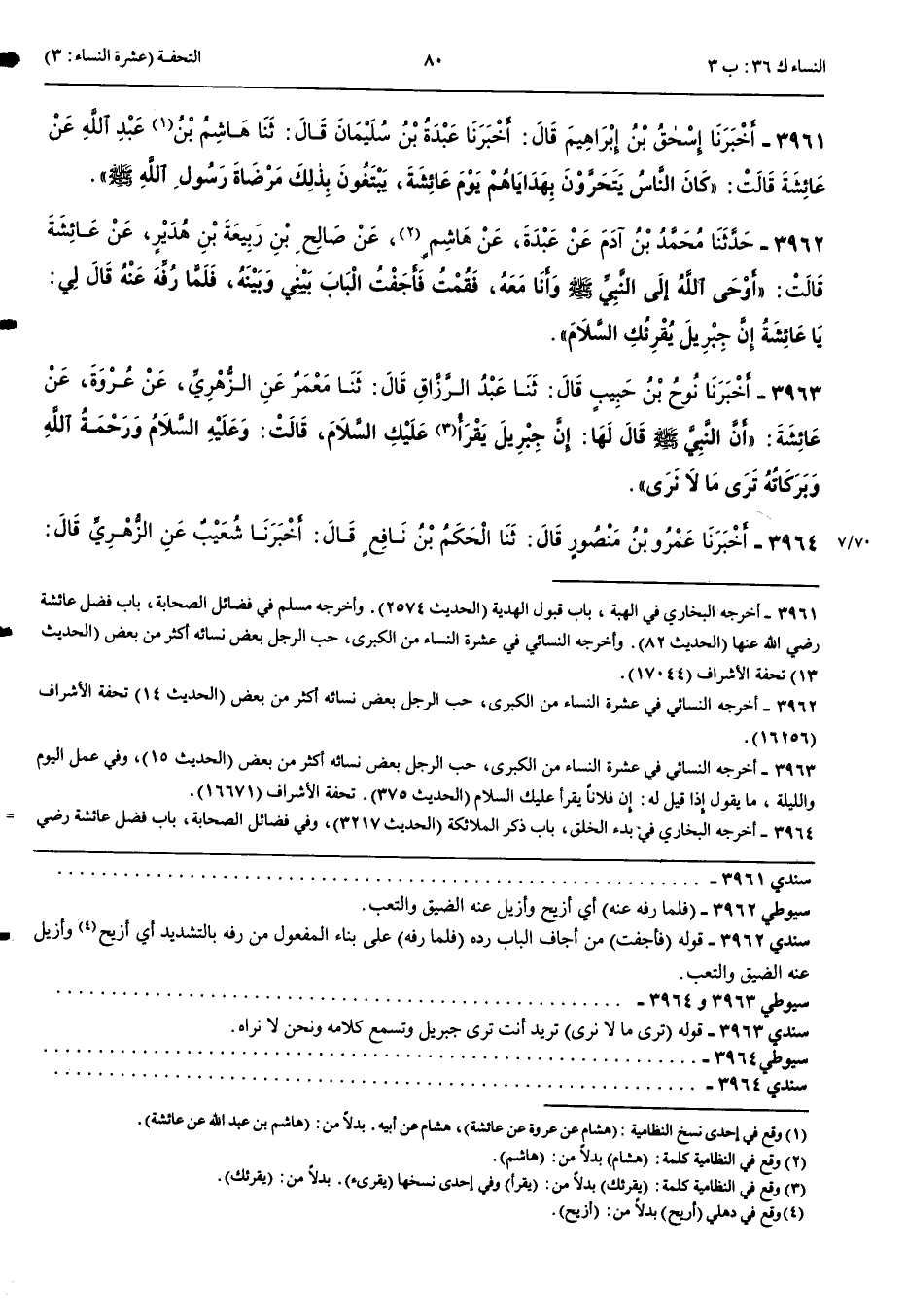 3962 - حَدَّثَنَا مُحَمَّدُ بْنُ آدَمَ عَنْ عَبْدَةَ عَنْ هِشَامٍ عَنْ صَالِحِ بْنِ رَبِيعَةَ بْنِ هُدَيْرٍ عَنْ عَائِشَةَ قَالَتْ أَوْحَى اللَّهُ إِلَى النَّبِيِّ صَلَّى اللَّهُ عَلَيْهِ وَسَلَّمَ وَأَنَا مَعَهُ فَقُمْتُ فَأَجَفْتُ الْبَابَ بَيْنِي وَبَيْنَهُ فَلَمَّا رُفِّهَ عَنْهُ قَالَ لِي يَا عَائِشَةُ إِنَّ جِبْرِيلَ يُقْرِئُكِ السَّلَامَ