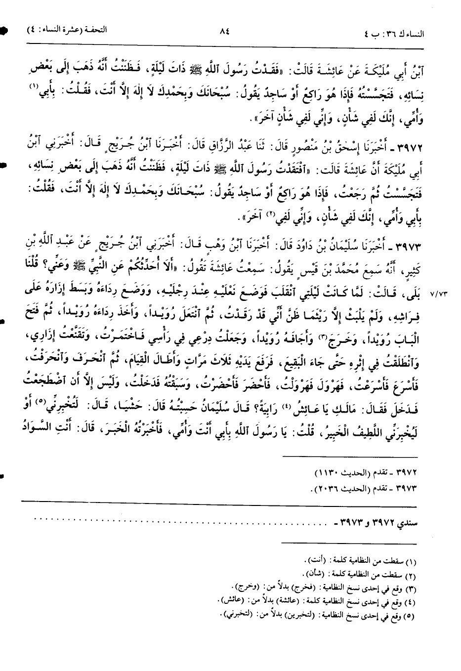 3972 - أَخْبَرَنَا إِسْحَقُ بْنُ مَنْصُورٍ قَالَ حَدَّثَنَا عَبْدُ الرَّزَّاقِ قَالَ أَنْبَأَنَا ابْنُ جُرَيْجٍ قَالَ أَخْبَرَنِي ابْنُ أَبِي مُلَيْكَةَ أَنَّ عَائِشَةَ قَالَتْ افْتَقَدْتُ رَسُولَ اللَّهِ صَلَّى اللَّهُ عَلَيْهِ وَسَلَّمَ ذَاتَ لَيْلَةٍ فَظَنَنْتُ أَنَّهُ ذَهَبَ إِلَى بَعْضِ نِسَائِهِ فَتَجَسَّسْتُ ثُمَّ رَجَعْتُ فَإِذَا هُوَ رَاكِعٌ أَوْ سَاجِدٌ يَقُولُ سُبْحَانَكَ وَبِحَمْدِكَ لَا إِلَهَ إِلَّا أَنْتَ فَقُلْتُ بِأَبِي وَأُمِّي إِنَّكَ لَفِي شَأْنٍ وَإِنِّي لَفِي آخَرَ