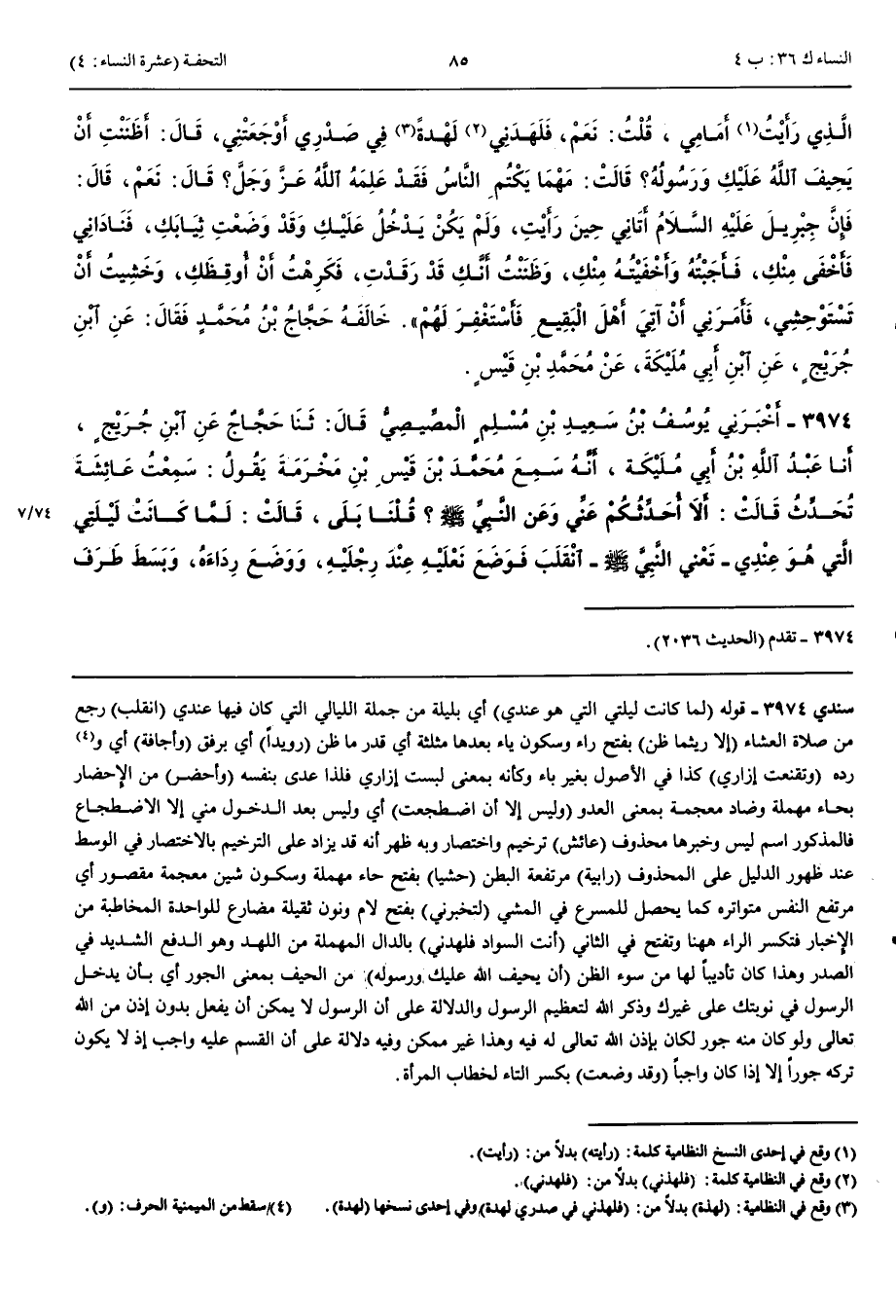 3974 - حَدَّثَنَا يُوسُفُ بْنُ سَعِيدِ بْنِ مُسْلِمٍ الْمِصِّيصِيُّ قَالَ حَدَّثَنَا حَجَّاجٌ عَنْ ابْنِ جُرَيْجٍ أَخْبَرَنِي عَبْدُ اللَّهِ ابْنُ أَبِي مُلَيْكَةَ أَنَّهُ سَمِعَ مُحَمَّدَ بْنَ قَيْسِ بْنِ مَخْرَمَةَ يَقُولُ سَمِعْتُ عَائِشَةَ تُحَدِّثُ قَالَتْ أَلَا أُحَدِّثُكُمْ عَنِّي وَعَنْ النَّبِيِّ صَلَّى اللَّهُ عَلَيْهِ وَسَلَّمَ قُلْنَا بَلَى قَالَتْ لَمَّا كَانَتْ لَيْلَتِي الَّتِي هُوَ عِنْدِي تَعْنِي النَّبِيَّ صَلَّى اللَّهُ عَلَيْهِ وَسَلَّمَ انْقَلَبَ فَوَضَعَ نَعْلَيْهِ عِنْدَ رِجْلَيْهِ وَوَضَعَ رِدَاءَهُ وَبَسَطَ طَرَفَ إِزَارِهِ عَلَى فِرَاشِهِ فَلَمْ يَلْبَثْ إِلَّا رَيْثَمَا ظَنَّ أَنِّي قَدْ رَقَدْتُ ثُمَّ انْتَعَلَ رُوَيْدًا وَأَخَذَ رِدَاءَهُ رُوَيْدًا ثُمَّ فَتَحَ الْبَابَ رُوَيْدًا وَخَرَجَ وَأَجَافَهُ رُوَيْدًا وَجَعَلْتُ دِرْعِي فِي رَأْسِي وَاخْتَمَرْتُ وَتَقَنَّعْتُ إِزَارِي فَانْطَلَقْتُ فِي إِثْرِهِ حَتَّى جَاءَ الْبَقِيعَ فَرَفَعَ يَدَيْهِ ثَلَاثَ مَرَّاتٍ وَأَطَالَ الْقِيَامَ ثُمَّ انْحَرَفَ فَانْحَرَفْتُ فَأَسْرَعَ فَأَسْرَعْتُ فَهَرْوَلَ فَهَرْوَلْتُ فَأَحْضَرَ فَأَحْضَرْتُ وَسَبَقْتُهُ فَدَخَلْتُ فَلَيْسَ إِلَّا أَنْ اضْطَجَعْتُ فَدَخَلَ فَقَالَ مَا لَكِ يَا عَائِشَةُ حَشْيَا رَابِيَةً قَالَتْ لَا قَالَ لَتُخْبِرِنِّي أَوْ لَيُخْبِرَنِّي اللَّطِيفُ الْخَبِيرُ قُلْتُ يَا رَسُولَ اللَّهِ بِأَبِي أَنْتَ وَأُمِّي فَأَخْبَرْتُهُ الْخَبَرَ قَالَ فَأَنْتِ السَّوَادُ الَّذِي رَأَيْتُهُ أَمَامِي قَالَتْ نَعَمْ قَالَتْ فَلَهَدَنِي فِي صَدْرِي لَهْدَةً أَوْجَعَتْنِي ثُمَّ قَالَ أَظَنَنْتِ أَنْ يَحِيفَ اللَّهُ عَلَيْكِ وَرَسُولُهُ قَالَتْ مَهْمَا يَكْتُمْ النَّاسُ فَقَدْ عَلِمَهُ اللَّهُ قَالَ نَعَمْ قَالَ فَإِنَّ جِبْرِيلَ عَلَيْهِ السَّلَام أَتَانِي حِينَ رَأَيْتِ وَلَمْ يَكُنْ يَدْخُلُ عَلَيْكِ وَقَدْ وَضَعْتِ ثِيَابَكِ فَنَادَانِي فَأَخْفَى مِنْكِ فَأَجَبْتُهُ فَأَخْفَيْتُ مِنْكِ فَظَنَنْتُ أَنْ قَدْ رَقَدْتِ وَخَشِيتُ أَنْ تَسْتَوْحِشِي فَأَمَرَنِي أَنْ آتِيَ أَهْلَ الْبَقِيعِ فَأَسْتَغْفِرَ لَهُمْ رَوَاهُ عَاصِمٌ عَنْ عَبْدِ اللَّهِ بْنِ عَامِرٍ عَنْ عَائِشَةَ عَلَى غَيْرِ هَذَا اللَّفْظِ 3975 - أَخْبَرَنَا عَلِيُّ بْنُ حُجْرٍ قَالَ أَنْبَأَنَا شَرِيكٌ عَنْ عَاصِمٍ عَنْ عَبْدِ اللَّهِ بْنِ عَامِرِ بْنِ رَبِيعَةَ عَنْ عَائِشَةَ قَالَتْ فَقَدْتُهُ مِنْ اللَّيْلِ وَسَاقَ الْحَدِيثَ