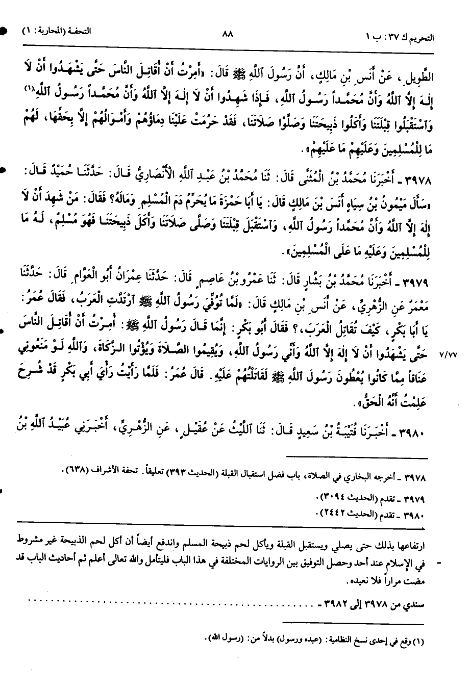 3978 - أَخْبَرَنَا مُحَمَّدُ بْنُ الْمُثَنَّى قَالَ حَدَّثَنَا مُحَمَّدُ بْنُ عَبْدِ اللَّهِ الْأَنْصَارِيُّ قَالَ أَنْبَأَنَا حُمَيْدٌ قَالَ سَأَلَ مَيْمُونُ بْنُ سِيَاهٍ أَنَسَ بْنَ مَالِكٍ قَالَ يَا أَبَا حَمْزَةَ مَا يُحَرِّمُ دَمَ الْمُسْلِمِ وَمَالَهُ فَقَالَ مَنْ شَهِدَ أَنْ لَا إِلَهَ إِلَّا اللَّهُ وَأَنَّ مُحَمَّدًا رَسُولُ اللَّهِ وَاسْتَقْبَلَ قِبْلَتَنَا وَصَلَّى صَلَاتَنَا وَأَكَلَ ذَبِيحَتَنَا فَهُوَ مُسْلِمٌ لَهُ مَا لِلْمُسْلِمِينَ وَعَلَيْهِ مَا عَلَى الْمُسْلِمِينَ