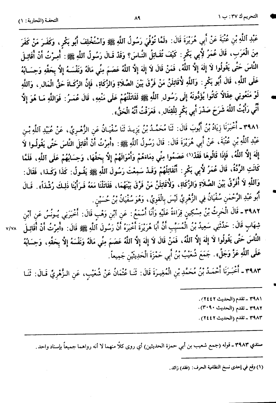 3981 - أَخْبَرَنَا زِيَادُ بْنُ أَيُّوبَ قَالَ حَدَّثَنَا مُحَمَّدُ بْنُ يَزِيدَ قَالَ حَدَّثَنَا سُفْيَانُ عَنْ الزُّهْرِيِّ عَنْ عُبَيْدِ اللَّهِ بْنِ عَبْدِ اللَّهِ بْنِ عُتْبَةَ عَنْ أَبِي هُرَيْرَةَ قَالَ قَالَ رَسُولُ اللَّهِ صَلَّى اللَّهُ عَلَيْهِ وَسَلَّمَ أُمِرْتُ أَنْ أُقَاتِلَ النَّاسَ حَتَّى يَقُولُوا لَا إِلَهَ إِلَّا اللَّهُ فَإِذَا قَالُوهَا فَقَدْ عَصَمُوا مِنِّي دِمَاءَهُمْ وَأَمْوَالَهُمْ إِلَّا بِحَقِّهَا وَحِسَابُهُمْ عَلَى اللَّهِ فَلَمَّا كَانَتْ الرِّدَّةُ قَالَ عُمَرُ لِأَبِي بَكْرٍ أَتُقَاتِلُهُمْ وَقَدْ سَمِعْتَ رَسُولَ اللَّهِ صَلَّى اللَّهُ عَلَيْهِ وَسَلَّمَ يَقُولُ كَذَا وَكَذَا فَقَالَ وَاللَّهِ لَا أُفَرِّقُ بَيْنَ الصَّلَاةِ وَالزَّكَاةِ وَلَأُقَاتِلَنَّ مَنْ فَرَّقَ بَيْنَهُمَا فَقَاتَلْنَا مَعَهُ فَرَأَيْنَا ذَلِكَ رُشْدًا قَالَ أَبُو عَبْد الرَّحْمَنِ سُفْيَانُ فِي الزُّهْرِيِّ لَيْسَ بِالْقَوِيِّ وَهُوَ سُفْيَانُ بْنُ حُسَيْنٍ