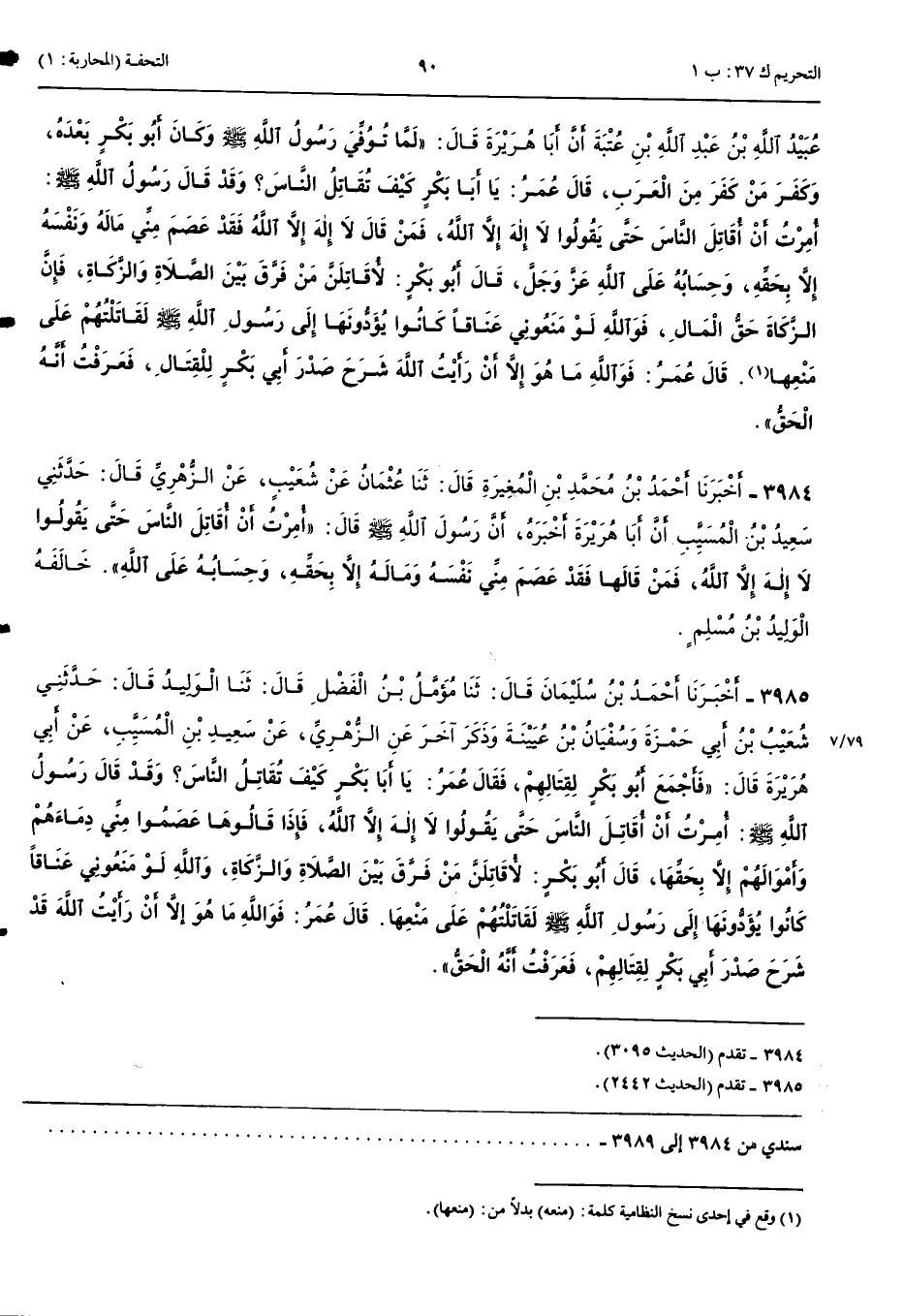 3985 - أَخْبَرَنَا أَحْمَدُ بْنُ سُلَيْمَانَ قَالَ حَدَّثَنَا مُؤَمَّلُ بْنُ الْفَضْلِ قَالَ حَدَّثَنَا الْوَلِيدُ قَالَ حَدَّثَنِي شُعَيْبُ بْنُ أَبِي حَمْزَةَ وَسُفْيَانُ بْنُ عُيَيْنَةَ وَذَكَر آخَر عَنْ الزُّهْرِيِّ عَنْ سَعِيدِ بْنِ الْمُسَيَّبِ عَنْ أَبِي هُرَيْرَةَ قَالَ فَأَجْمَعَ أَبُو بَكْرٍ لِقِتَالِهِمْ فَقَالَ عُمَرُ يَا أَبَا بَكْرٍ كَيْفَ تُقَاتِلُ النَّاسَ وَقَدْ قَالَ رَسُولُ اللَّهِ صَلَّى اللَّهُ عَلَيْهِ وَسَلَّمَ أُمِرْتُ أَنْ أُقَاتِلَ النَّاسَ حَتَّى يَقُولُوا لَا إِلَهَ إِلَّا اللَّهُ فَإِذَا قَالُوهَا عَصَمُوا مِنِّي دِمَاءَهُمْ وَأَمْوَالَهُمْ إِلَّا بِحَقِّهَا قَالَ أَبُو بَكْرٍ لَأُقَاتِلَنَّ مَنْ فَرَّقَ بَيْنَ الصَّلَاةِ وَالزَّكَاةِ وَاللَّهِ لَوْ مَنَعُونِي عَنَاقًا كَانُوا يُؤَدُّونَهَا إِلَى رَسُولِ اللَّهِ صَلَّى اللَّهُ عَلَيْهِ وَسَلَّمَ لَقَاتَلْتُهُمْ عَلَى مَنْعِهَا قَالَ عُمَرُ فَوَاللَّهِ مَا هُوَ إِلَّا أَنْ رَأَيْتُ اللَّهَ قَدْ شَرَحَ صَدْرَ أَبِي بَكْرٍ لِقِتَالِهِمْ فَعَرَفْتُ أَنَّهُ الْحَقُّ