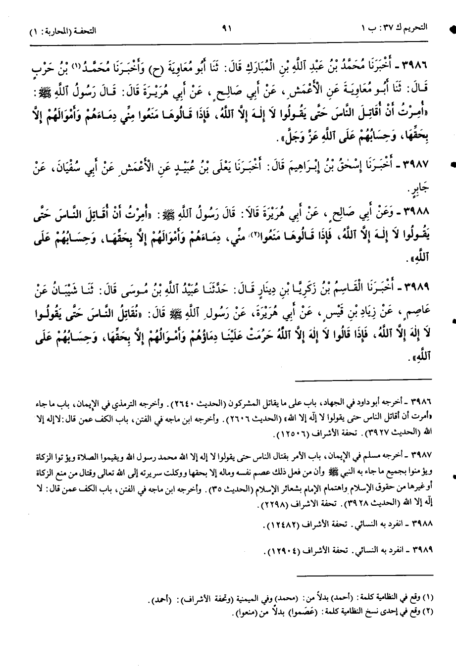 3986 - أَخْبَرَنَا مُحَمَّدُ بْنُ عَبْدِ اللَّهِ بْنِ الْمُبَارَكِ قَالَ حَدَّثَنَا أَبُو مُعَاوِيَةَ ح وَأَنْبَأَنَا أَحْمَدُ بْنُ حَرْبٍ قَالَ حَدَّثَنَا أَبُو مُعَاوِيَةَ عَنْ الْأَعْمَشِ عَنْ أَبِي صَالِحٍ عَنْ أَبِي هُرَيْرَةَ قَالَ قَالَ رَسُولُ اللَّهِ صَلَّى اللَّهُ عَلَيْهِ وَسَلَّمَ أُمِرْتُ أَنْ أُقَاتِلَ النَّاسَ حَتَّى يَقُولُوا لَا إِلَهَ إِلَّا اللَّهُ فَإِذَا قَالُوهَا مَنَعُوا مِنِّي دِمَاءَهُمْ وَأَمْوَالَهُمْ إِلَّا بِحَقِّهَا وَحِسَابُهُمْ عَلَى اللَّهِ عَزَّ وَجَلَّ