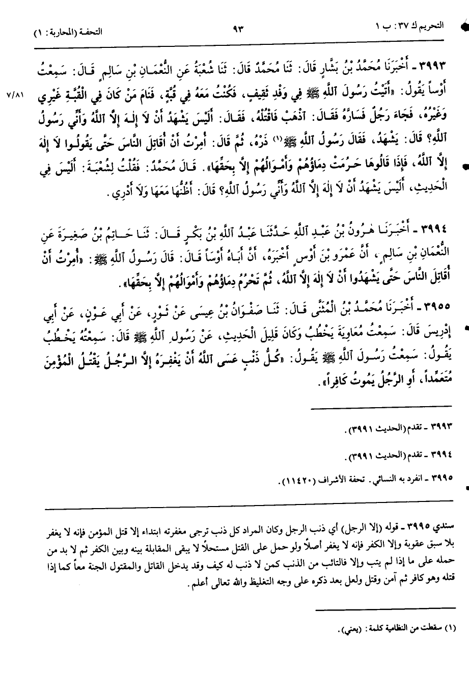 3993 - أَخْبَرَنَا مُحَمَّدُ بْنُ بَشَّارٍ قَالَ حَدَّثَنَا مُحَمَّدٌ قَالَ حَدَّثَنَا شُعْبَةُ عَنْ النُّعْمَانِ بْنِ سَالِمٍ قَالَ سَمِعْتُ أَوْسًا يَقُولُ أَتَيْتُ رَسُولُ اللَّهِ صَلَّى اللَّهُ عَلَيْهِ وَسَلَّمَ فِي وَفْدِ ثَقِيفٍ فَكُنْتُ مَعَهُ فِي قُبَّةٍ فَنَامَ مَنْ كَانَ فِي الْقُبَّةِ غَيْرِي وَغَيْرُهُ فَجَاءَ رَجُلٌ فَسَارَّهُ فَقَالَ اذْهَبْ فَاقْتُلْهُ فَقَالَ أَلَيْسَ يَشْهَدُ أَنْ لَا إِلَهَ إِلَّا اللَّهُ وَأَنِّي رَسُولُ اللَّهِ قَالَ يَشْهَدُ فَقَالَ رَسُولُ اللَّهِ صَلَّى اللَّهُ عَلَيْهِ وَسَلَّمَ ذَرْهُ ثُمَّ قَالَ أُمِرْتُ أَنْ أُقَاتِلَ النَّاسَ حَتَّى يَقُولُوا لَا إِلَهَ إِلَّا اللَّهُ فَإِذَا قَالُوهَا حَرُمَتْ دِمَاؤُهُمْ وَأَمْوَالُهُمْ إِلَّا بِحَقِّهَا قَالَ مُحَمَّدٌ فَقُلْتُ لِشُعْبَةَ أَلَيْسَ فِي الْحَدِيثِ أَلَيْسَ يَشْهَدُ أَنْ لَا إِلَهَ إِلَّا اللَّهُ وَأَنِّي رَسُولُ اللَّهِ قَالَ أَظُنُّهَا مَعَهَا وَلَا أَدْرِي