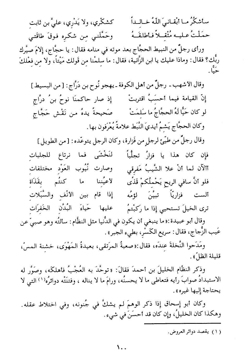 وذكر النظّام الخليل بن أحمد فقال: «توحّد به العجب فأهلكه، وصوّر له الاستبداد صواب رأيه فتعاطى ما لا يحسنه، ورام ما لا يناله، وفتنته دوائره «1» التي لا يحتاجه إليها غيره» .