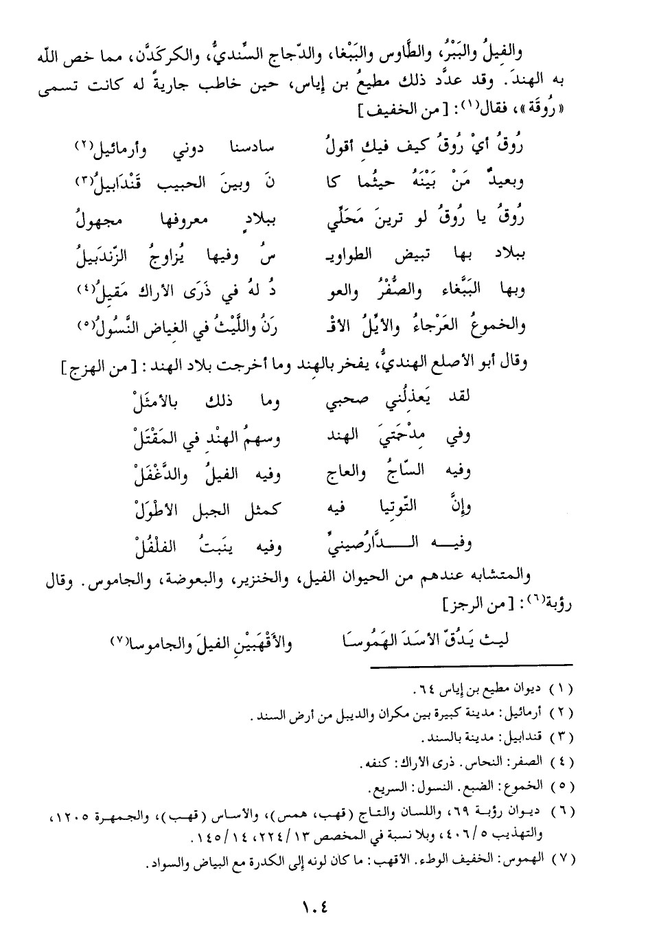 والفيل والببر، والطّاوس والببغا، والدّجاج السّنديّ، والكركدّن، مما خص الله به الهند. وقد عدّد ذلك مطيع بن إياس، حين خاطب جارية له كانت تسمى «روقة» ، فقال «1» : [من الخفيف]