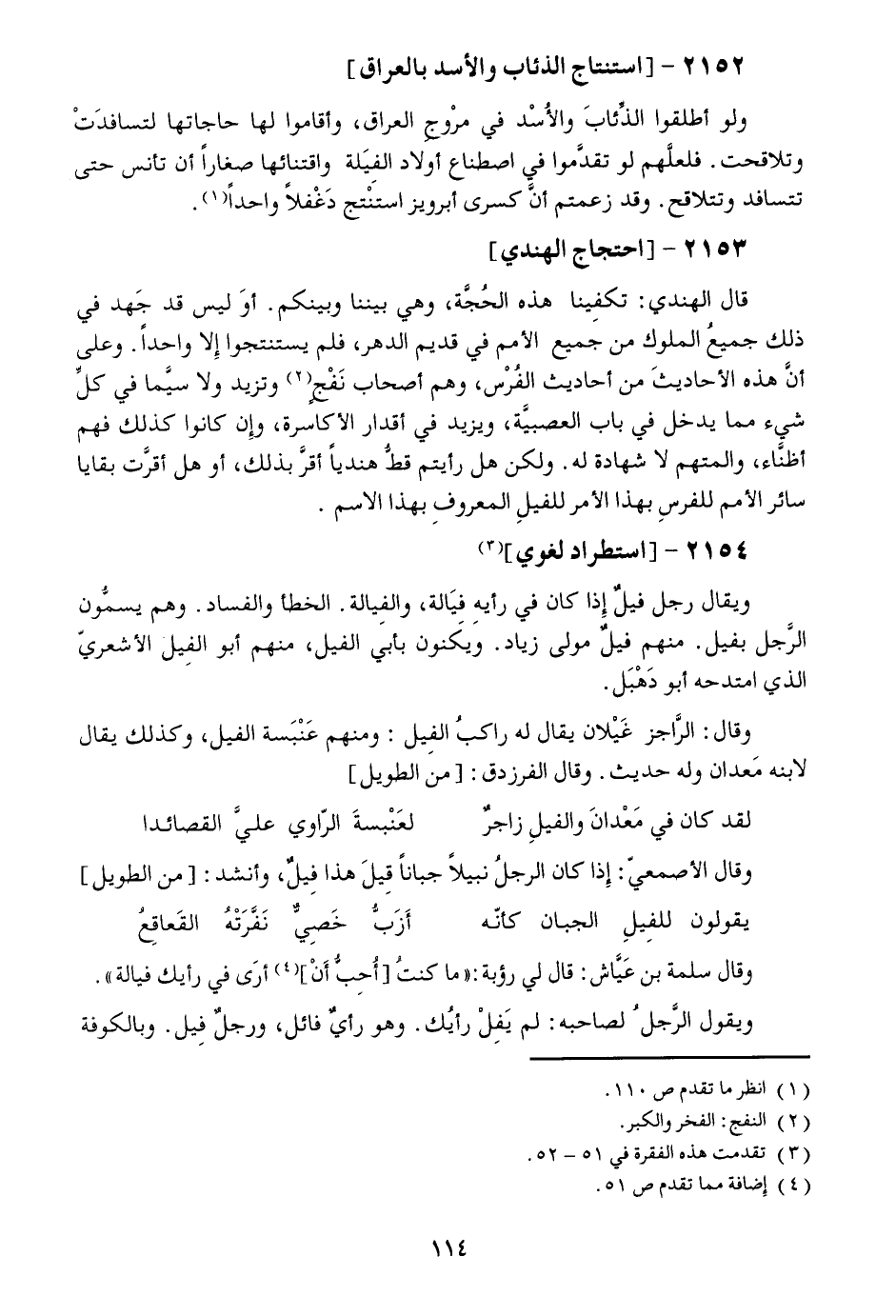 قال الهندي: تكفينا هذه الحجّة، وهي بيننا وبينكم. أو ليس قد جهد في ذلك جميع الملوك من جميع الأمم في قديم الدهر، فلم يستنتجوا إلا واحدا. وعلى أنّ هذه الأحاديث من أحاديث الفرس، وهم أصحاب نفج «2» وتزيد ولا سيّما في كلّ شيء مما يدخل في باب العصبيّة، ويزيد في أقدار الأكاسرة، وإن كانوا كذلك فهم أظنّاء، والمتهم لا شهادة له. ولكن هل رأيتم قطّ هنديا أقرّ بذلك، أو هل أقرّت بقايا سائر الأمم للفرس بهذا الأمر للفيل المعروف بهذا الاسم.