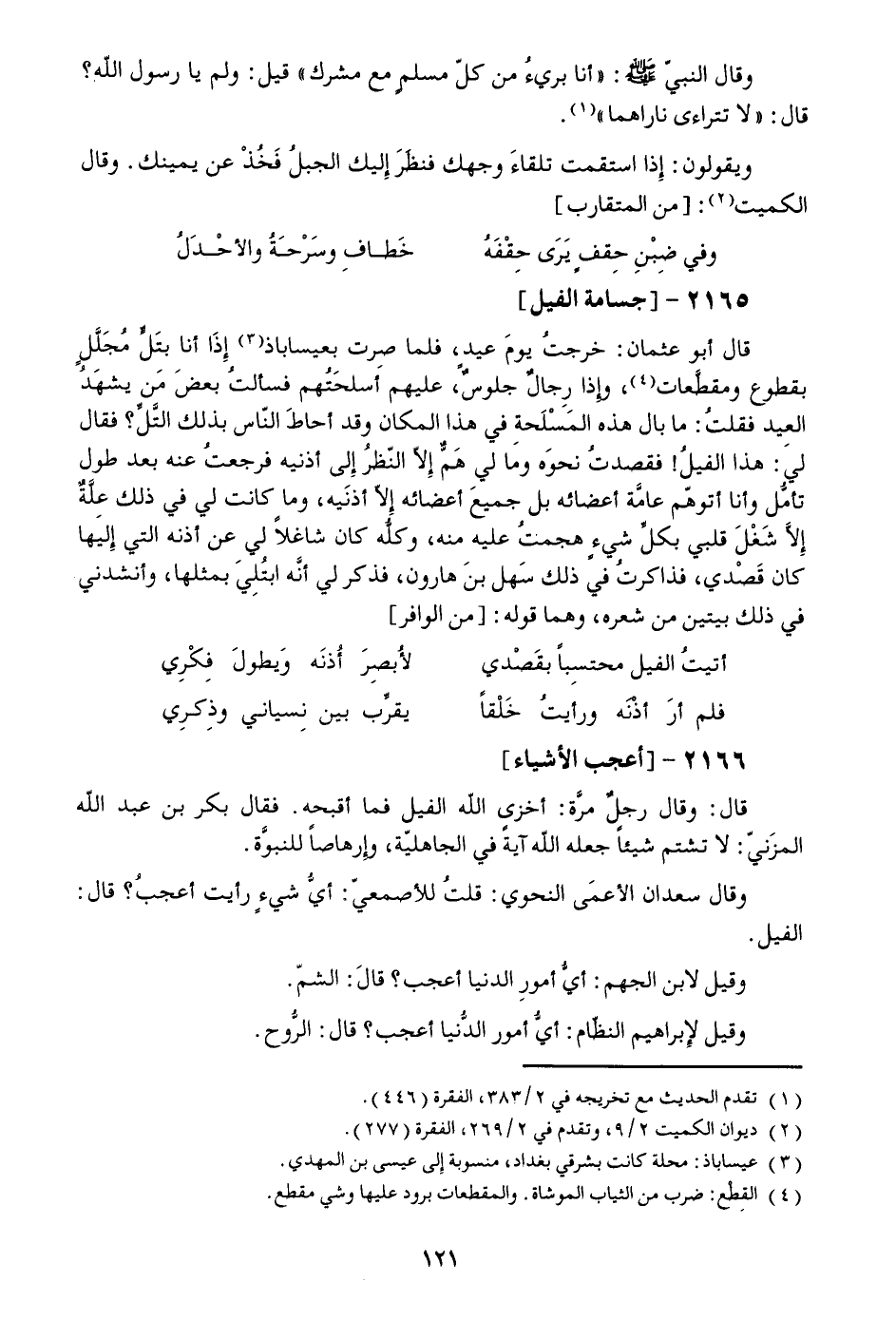 قال أبو عثمان: خرجت يوم عيد، فلما صرت بعيسا باذ «3» إذا أنا بتلّ مجلّل بقطوع ومقطّعات «4» ، وإذا رجال جلوس، عليهم أسلحتهم فسألت بعض من يشهد العيد فقلت: ما بال هذه المسلحة في هذا المكان وقد أحاط النّاس بذلك التّلّ؟ فقال لي: هذا الفيل! فقصدت نحوه وما لي همّ إلّا النّظر إلى أذنيه فرجعت عنه بعد طول تأمّل وأنا أتوهّم عامّة أعضائه بل جميع أعضائه إلّا أذنيه، وما كانت لي في ذلك علّة إلّا شغل قلبي بكلّ شيء هجمت عليه منه، وكلّه كان شاغلا لي عن أذنه التي إليها كان قصدي، فذاكرت في ذلك سهل بن هارون، فذكر لي أنّه ابتلي بمثلها، وأنشدني في ذلك بيتين من شعره، وهما قوله: [من الوافر]
