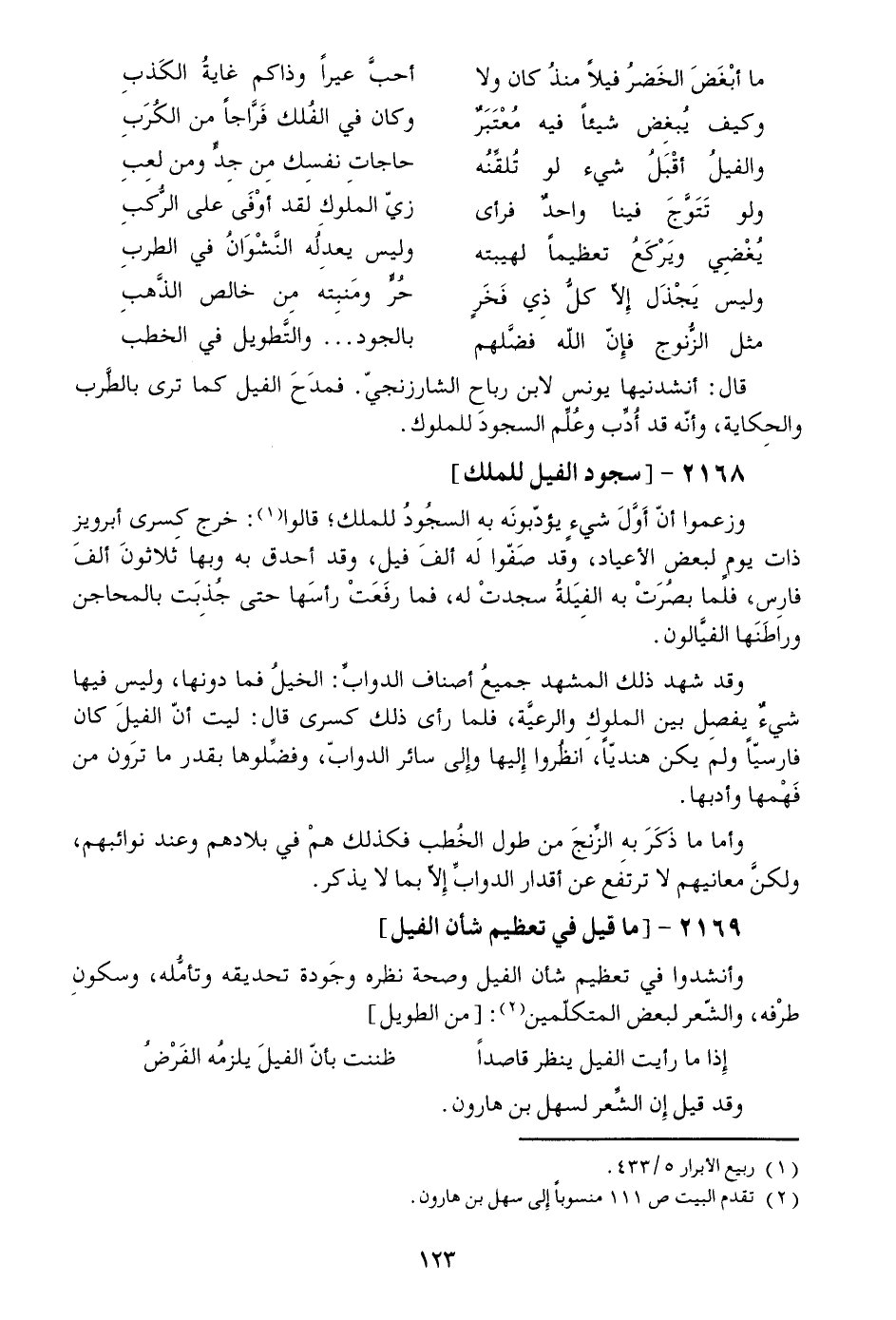 قال: أنشدنيها يونس لابن رباح الشارزنجيّ. فمدح الفيل كما ترى بالطّرب والحكاية، وأنّه قد أدّب وعلّم السجود للملوك.