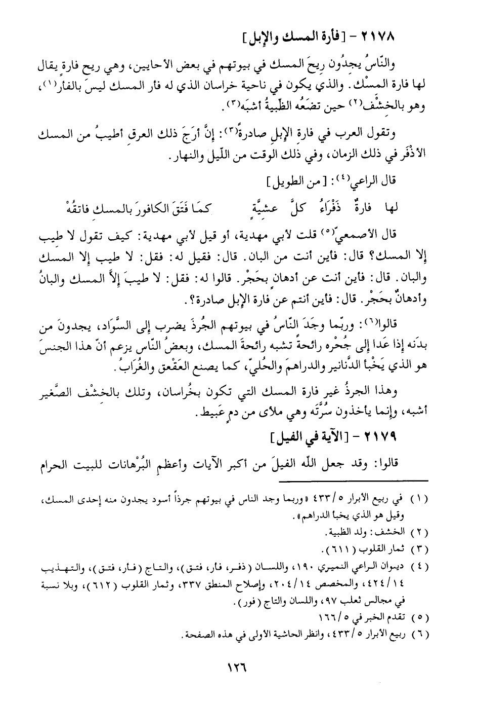 وتقول العرب في فارة الإبل صادرة «4» : إنّ أرج ذلك العرق أطيب من المسك الأذفر في ذلك الزمان، وفي ذلك الوقت من اللّيل والنهار.