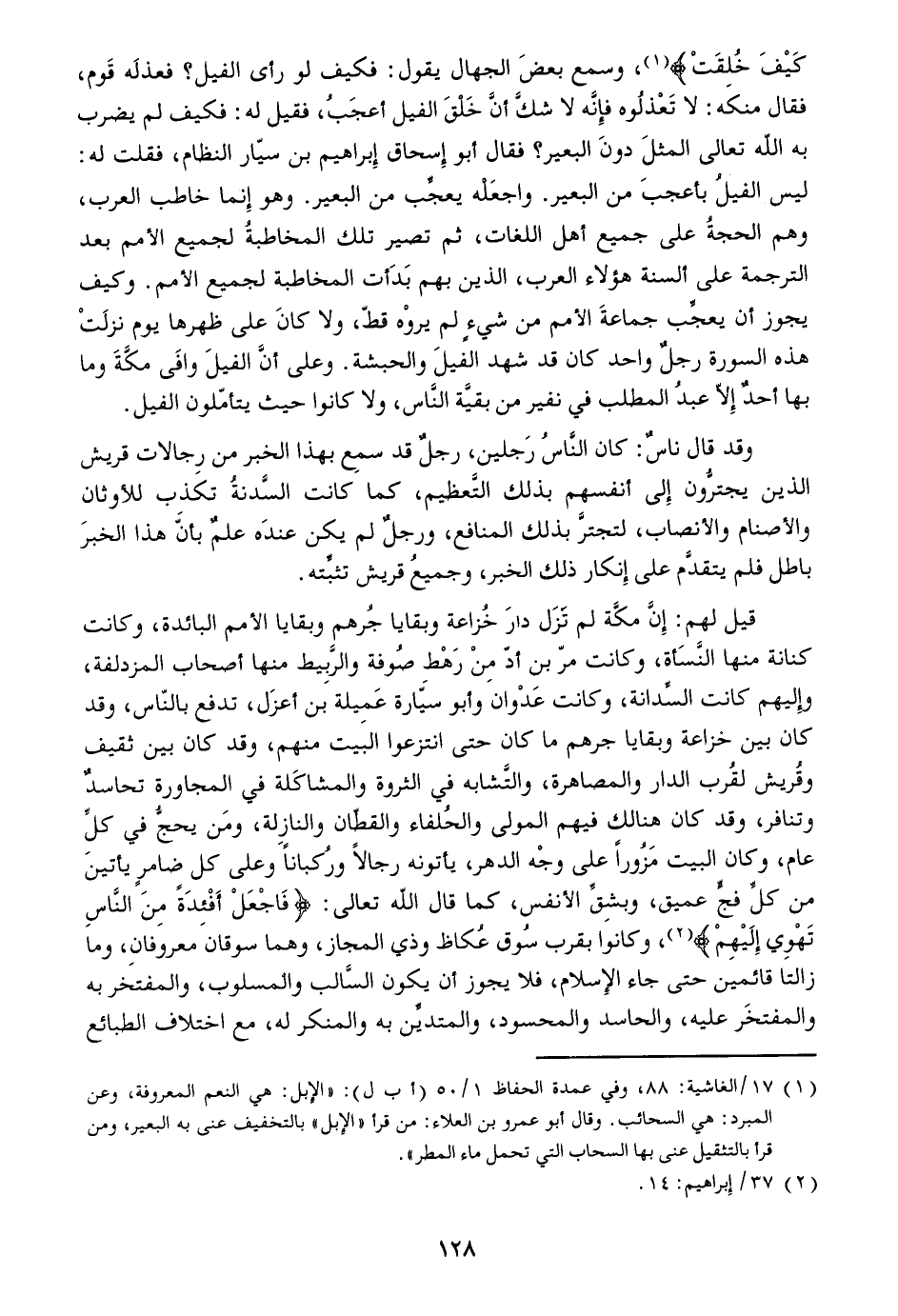 ليس الفيل بأعجب من البعير. واجعله يعجّب من البعير. وهو إنما خاطب العرب، وهم الحجة على جميع أهل اللغات، ثم تصير تلك المخاطبة لجميع الأمم بعد الترجمة على ألسنة هؤلاء العرب، الذين بهم بدأت المخاطبة لجميع الأمم. وكيف يجوز أن يعجّب جماعة الأمم من شيء لم يروه قطّ، ولا كان على ظهرها يوم نزلت هذه السورة رجل واحد كان قد شهد الفيل والحبشة. وعلى أنّ الفيل وافى مكّة وما بها أحد إلّا عبد المطلب في نفير من بقيّة النّاس، ولا كانوا حيث يتأمّلون الفيل.
