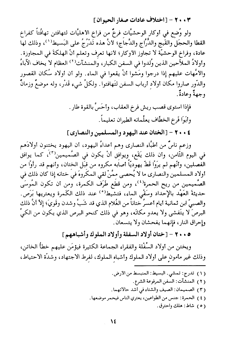 وزعم ناس من أطبّاء النصارى وهم أعداء اليهود، أن اليهود يختنون أولادهم في اليوم الثّامن، وأن ذلك يقع، ويوافق أن يكون في الصّميمين «3» ، كما يوافق الفصلين، وأنّهم لم يروا قطّ يهوديّا أصابه مكروه من قبل الختان، وأنهم قد رأوا من أولاد المسلمين والنصارى ما لا يحصى ممّن لقي المكروه في ختانه إذا كان ذلك في الصّميمين من ريح الحمرة «4» ، ومن قطع طرف الكمرة، ومن أن تكون الموسى حديثة العهد بالإحداد وسقي الماء، فتشيط «5» عند ذلك الكمرة ويعتريها برص.