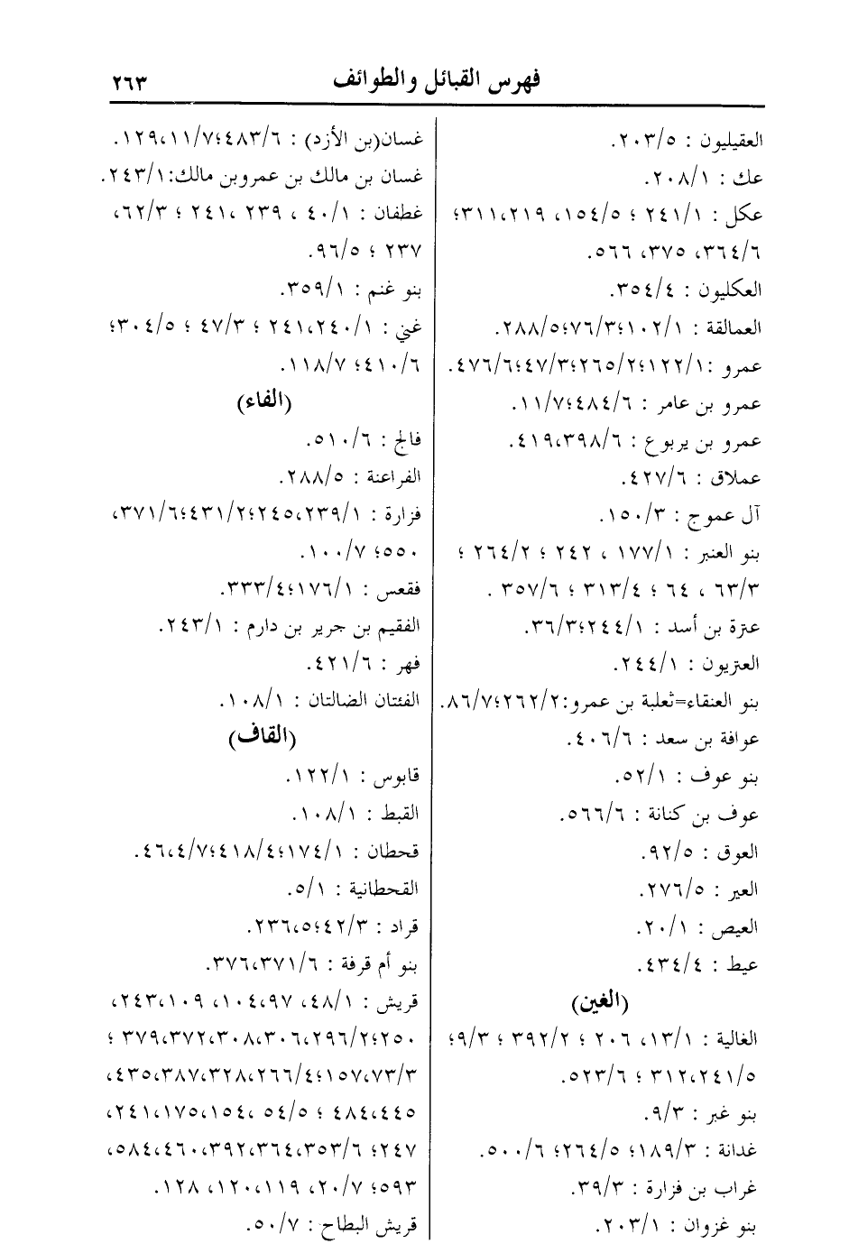 قريش: 1/48، 97، 104، 109، 243، 250؛ 2/296، 306، 308، 372، 379؛ 3/73، 157؛ 4/266، 328، 387، 435، 445، 484؛ 5/54، 154، 175، 241، 247؛ 6/353، 364، 392، 460، 584، 593؛ 7/20، 119، 120، 128.